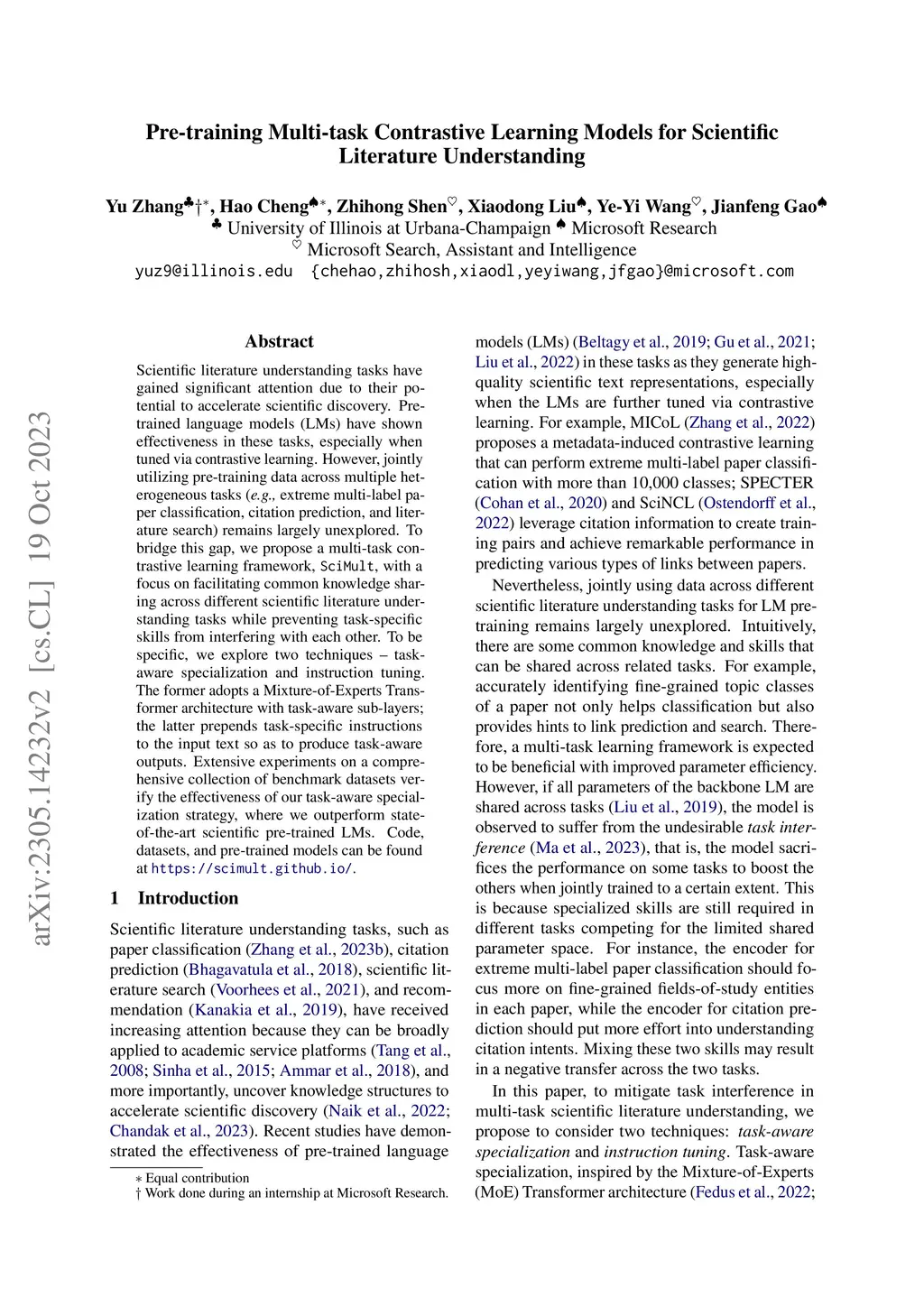 Scientific literature understanding tasks have gained significant attention due to their potential to accelerate scientific discovery. Pre-trained language models (LMs) have shown effectiveness in these tasks, especially when tuned via contrastive learning. However, jointly utilizing pre-training data across multiple heterogeneous tasks (e.g., extreme multi-label paper classification, citation prediction, and literature search) remains largely unexplored. To bridge this gap, we propose a multi-task contrastive learning framework, SciMult, with a focus on facilitating common knowledge sharing across different scientific literature understanding tasks while preventing task-specific skills from interfering with each other. To be specific, we explore two techniques -- task-aware specialization and instruction tuning. The former adopts a Mixture-of-Experts Transformer architecture with task-aware sub-layers; the latter prepends task-specific instructions to the input text so as to produce task-aware outputs. Extensive experiments on a comprehensive collection of benchmark datasets verify the effectiveness of our task-aware specialization strategy, where we outperform state-of-the-art scientific pre-trained LMs. Code, datasets, and pre-trained models can be found at https://scimult.github.io/.