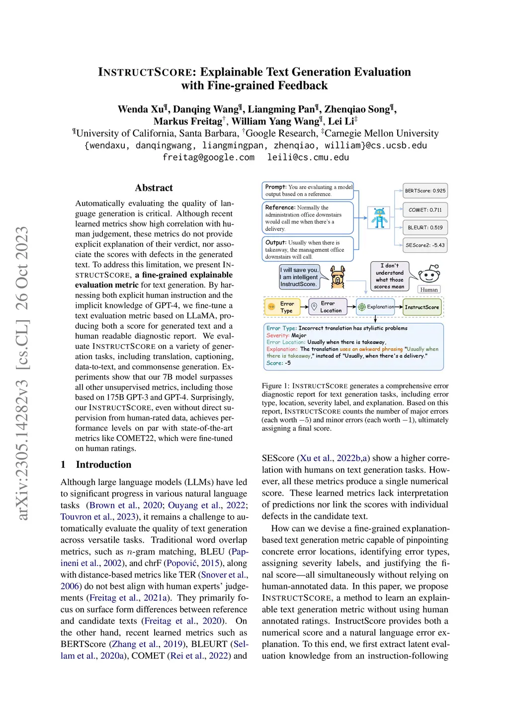 Automatically evaluating the quality of language generation is critical. Although recent learned metrics show high correlation with human judgement, these metrics can not explain their verdict or associate the scores with defects in generated text. To address this limitation, we present InstructScore, an explainable evaluation metric for text generation. By harnessing both explicit human instruction and the implicit knowledge of GPT-4, we fine-tune a text evaluation metric based on LLaMA, producing both a score for generated text and a human readable diagnostic report. We evaluate InstructScore on a variety of generation tasks, including translation, captioning, data-to-text and commonsense generation. Experiments show that our 7B model surpasses all other unsupervised metrics, including those based on 175B GPT-3 and GPT-4. Surprisingly, our InstructScore, even without direct supervision from human-rated data, achieves performance levels on par with state-of-the-art metrics like COMET22, which were fine-tuned on human ratings.