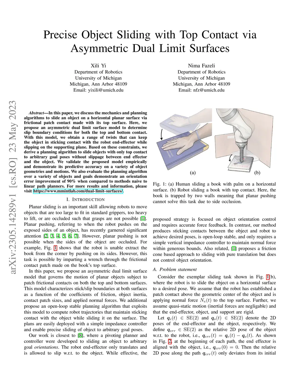 Precise Object Sliding with Top Contact via Asymmetric Dual Limit