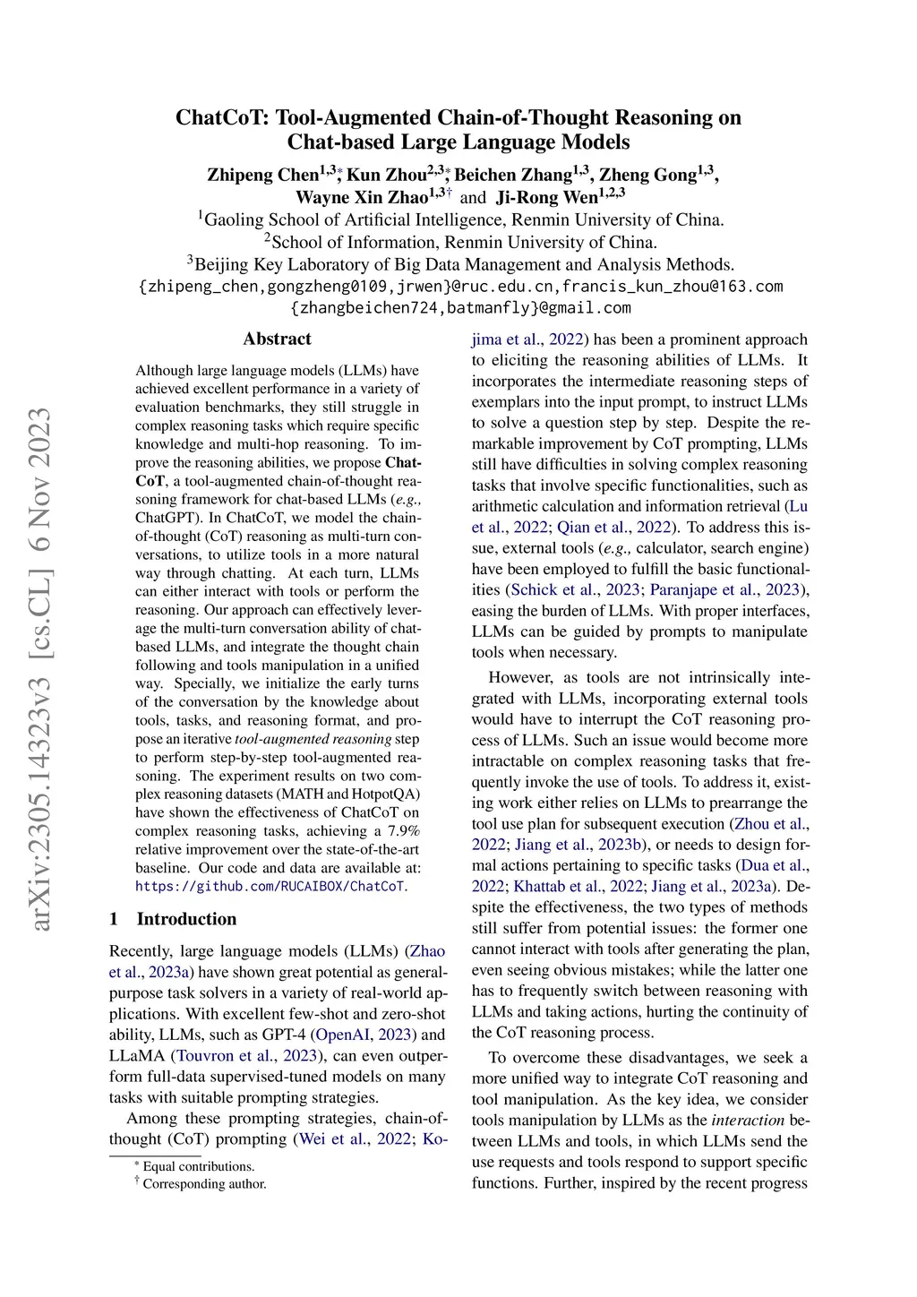 ChatCoT: Tool-Augmented Chain-of-Thought Reasoning on Chat-based Large