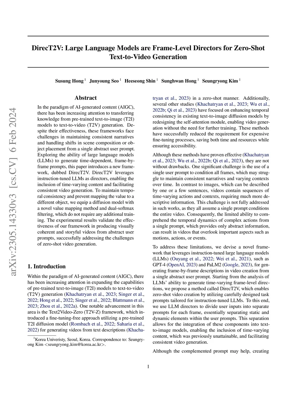 In the paradigm of AI-generated content (AIGC), there has been increasing attention in extending pre-trained text-to-image (T2I) models to text-to-video (T2V) generation. Despite their effectiveness, these frameworks face challenges in maintaining consistent narratives and handling rapid shifts in scene composition or object placement from a single user prompt. This paper introduces a new framework, dubbed DirecT2V, which leverages instruction-tuned large language models (LLMs) to generate frame-by-frame descriptions from a single abstract user prompt. DirecT2V utilizes LLM directors to divide user inputs into separate prompts for each frame, enabling the inclusion of time-varying content and facilitating consistent video generation. To maintain temporal consistency and prevent object collapse, we propose a novel value mapping method and dual-softmax filtering. Extensive experimental results validate the effectiveness of the DirecT2V framework in producing visually coherent and consistent videos from abstract user prompts, addressing the challenges of zero-shot video generation.