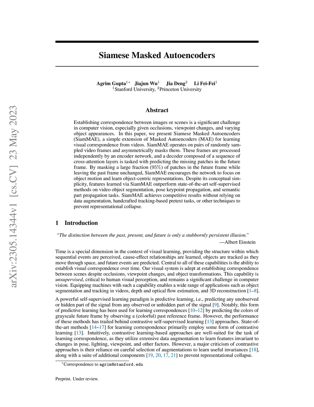 Establishing correspondence between images or scenes is a significant challenge in computer vision, especially given occlusions, viewpoint changes, and varying object appearances. In this paper, we present Siamese Masked Autoencoders (SiamMAE), a simple extension of Masked Autoencoders (MAE) for learning visual correspondence from videos. SiamMAE operates on pairs of randomly sampled video frames and asymmetrically masks them. These frames are processed independently by an encoder network, and a decoder composed of a sequence of cross-attention layers is tasked with predicting the missing patches in the future frame. By masking a large fraction () of patches in the future frame while leaving the past frame unchanged, SiamMAE encourages the network to focus on object motion and learn object-centric representations. Despite its conceptual simplicity, features learned via SiamMAE outperform state-of-the-art self-supervised methods on video object segmentation, pose keypoint propagation, and semantic part propagation tasks. SiamMAE achieves competitive results without relying on data augmentation, handcrafted tracking-based pretext tasks, or other techniques to prevent representational collapse.