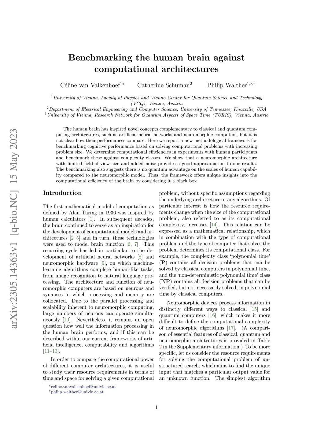 The human brain has inspired novel concepts complementary to classical and quantum computing architectures, such as artificial neural networks and neuromorphic computers, but it is not clear how their performances compare. Here we report a new methodological framework for benchmarking cognitive performance based on solving computational problems with increasing problem size. We determine computational efficiencies in experiments with human participants and benchmark these against complexity classes. We show that a neuromorphic architecture with limited field-of-view size and added noise provides a good approximation to our results. The benchmarking also suggests there is no quantum advantage on the scales of human capability compared to the neuromorphic model. Thus, the framework offers unique insights into the computational efficiency of the brain by considering it a black box.
