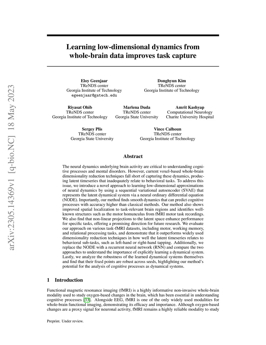 The neural dynamics underlying brain activity are critical to understanding cognitive processes and mental disorders. However, current voxel-based whole-brain dimensionality reduction techniques fall short of capturing these dynamics, producing latent timeseries that inadequately relate to behavioral tasks. To address this issue, we introduce a novel approach to learning low-dimensional approximations of neural dynamics by using a sequential variational autoencoder (SVAE) that represents the latent dynamical system via a neural ordinary differential equation (NODE). Importantly, our method finds smooth dynamics that can predict cognitive processes with accuracy higher than classical methods. Our method also shows improved spatial localization to task-relevant brain regions and identifies well-known structures such as the motor homunculus from fMRI motor task recordings. We also find that non-linear projections to the latent space enhance performance for specific tasks, offering a promising direction for future research. We evaluate our approach on various task-fMRI datasets, including motor, working memory, and relational processing tasks, and demonstrate that it outperforms widely used dimensionality reduction techniques in how well the latent timeseries relates to behavioral sub-tasks, such as left-hand or right-hand tapping. Additionally, we replace the NODE with a recurrent neural network (RNN) and compare the two approaches to understand the importance of explicitly learning a dynamical system. Lastly, we analyze the robustness of the learned dynamical systems themselves and find that their fixed points are robust across seeds, highlighting our method's potential for the analysis of cognitive processes as dynamical systems.