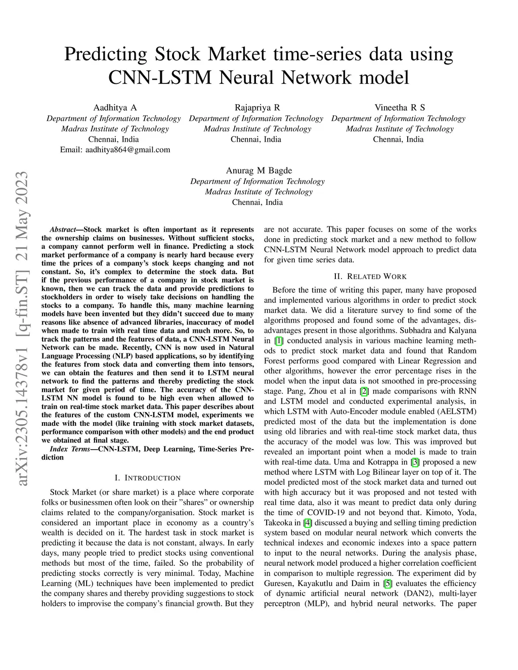 Stock market is often important as it represents the ownership claims on businesses. Without sufficient stocks, a company cannot perform well in finance. Predicting a stock market performance of a company is nearly hard because every time the prices of a company stock keeps changing and not constant. So, its complex to determine the stock data. But if the previous performance of a company in stock market is known, then we can track the data and provide predictions to stockholders in order to wisely take decisions on handling the stocks to a company. To handle this, many machine learning models have been invented but they didn't succeed due to many reasons like absence of advanced libraries, inaccuracy of model when made to train with real time data and much more. So, to track the patterns and the features of data, a CNN-LSTM Neural Network can be made. Recently, CNN is now used in Natural Language Processing (NLP) based applications, so by identifying the features from stock data and converting them into tensors, we can obtain the features and then send it to LSTM neural network to find the patterns and thereby predicting the stock market for given period of time. The accuracy of the CNN-LSTM NN model is found to be high even when allowed to train on real-time stock market data. This paper describes about the features of the custom CNN-LSTM model, experiments we made with the model (like training with stock market datasets, performance comparison with other models) and the end product we obtained at final stage.