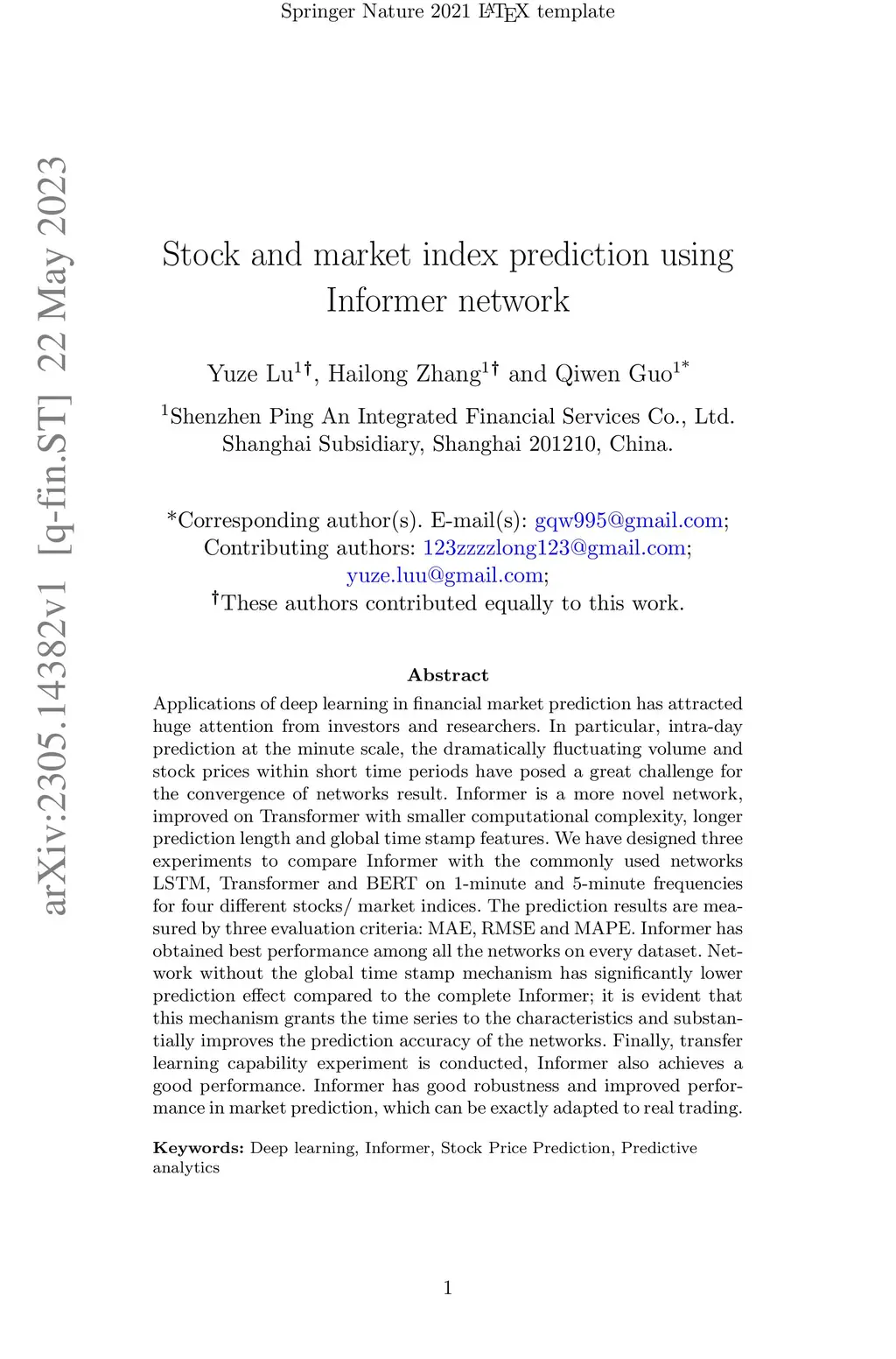 Applications of deep learning in financial market prediction has attracted huge attention from investors and researchers. In particular, intra-day prediction at the minute scale, the dramatically fluctuating volume and stock prices within short time periods have posed a great challenge for the convergence of networks result. Informer is a more novel network, improved on Transformer with smaller computational complexity, longer prediction length and global time stamp features. We have designed three experiments to compare Informer with the commonly used networks LSTM, Transformer and BERT on 1-minute and 5-minute frequencies for four different stocks/ market indices. The prediction results are measured by three evaluation criteria: MAE, RMSE and MAPE. Informer has obtained best performance among all the networks on every dataset. Network without the global time stamp mechanism has significantly lower prediction effect compared to the complete Informer; it is evident that this mechanism grants the time series to the characteristics and substantially improves the prediction accuracy of the networks. Finally, transfer learning capability experiment is conducted, Informer also achieves a good performance. Informer has good robustness and improved performance in market prediction, which can be exactly adapted to real trading.