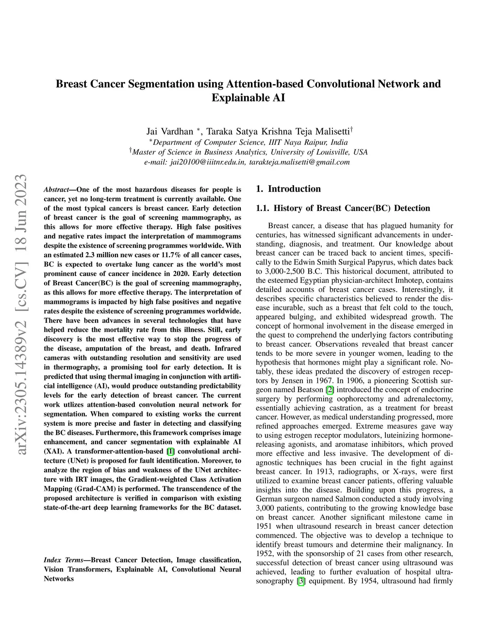 Breast cancer (BC) remains a significant health threat, with no long-term cure currently available. Early detection is crucial, yet mammography interpretation is hindered by high false positives and negatives. With BC incidence projected to surpass lung cancer, improving early detection methods is vital. Thermography, using high-resolution infrared cameras, offers promise, especially when combined with artificial intelligence (AI). This work presents an attention-based convolutional neural network for segmentation, providing increased speed and precision in BC detection and classification. The system enhances images and performs cancer segmentation with explainable AI. We propose a transformer-attention-based convolutional architecture (UNet) for fault identification and employ Gradient-weighted Class Activation Mapping (Grad-CAM) to analyze areas of bias and weakness in the UNet architecture with IRT images. The superiority of our proposed framework is confirmed when compared with existing deep learning frameworks.