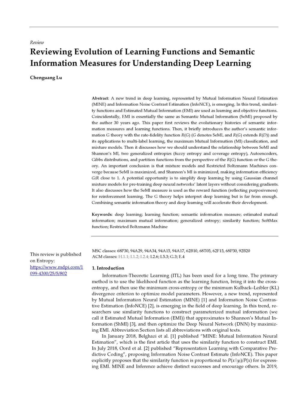 A new trend in deep learning, represented by Mutual Information Neural Estimation (MINE) and Information Noise Contrast Estimation (InfoNCE), is emerging. In this trend, similarity functions and Estimated Mutual Information (EMI) are used as learning and objective functions. Coincidentally, EMI is essentially the same as Semantic Mutual Information (SeMI) proposed by the author 30 years ago. This paper first reviews the evolutionary histories of semantic information measures and learning functions. Then, it briefly introduces the author's semantic information G theory with the rate-fidelity function R(G) (G denotes SeMI, and R(G) extends R(D)) and its applications to multi-label learning, the maximum Mutual Information (MI) classification, and mixture models. Then it discusses how we should understand the relationship between SeMI and Shan-non's MI, two generalized entropies (fuzzy entropy and coverage entropy), Autoencoders, Gibbs distributions, and partition functions from the perspective of the R(G) function or the G theory. An important conclusion is that mixture models and Restricted Boltzmann Machines converge because SeMI is maximized, and Shannon's MI is minimized, making information efficiency G/R close to 1. A potential opportunity is to simplify deep learning by using Gaussian channel mixture models for pre-training deep neural networks' latent layers without considering gradients. It also discusses how the SeMI measure is used as the reward function (reflecting purposiveness) for reinforcement learning. The G theory helps interpret deep learning but is far from enough. Combining semantic information theory and deep learning will accelerate their development.