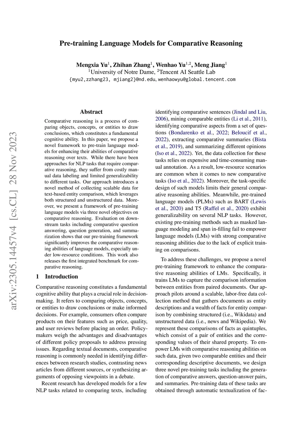 Pre-training Language Models for Comparative Reasoning