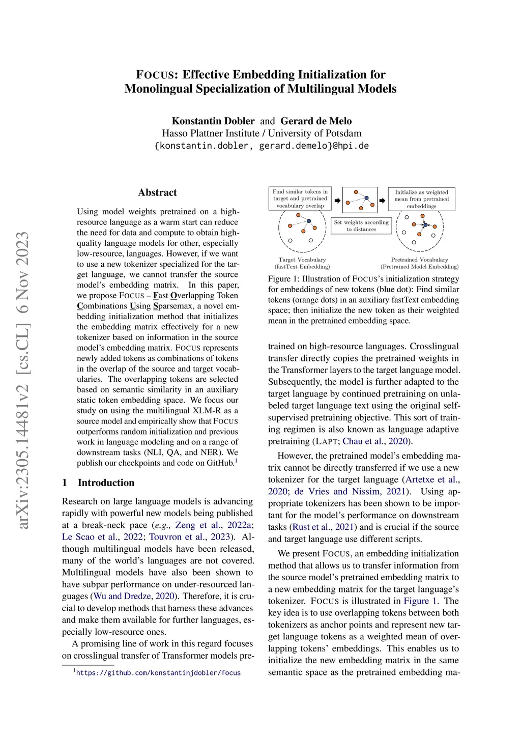 Using model weights pretrained on a high-resource language as a warm start can reduce the need for data and compute to obtain high-quality language models for other, especially low-resource, languages. However, if we want to use a new tokenizer specialized for the target language, we cannot transfer the source model's embedding matrix. In this paper, we propose FOCUS - Fast Overlapping Token Combinations Using Sparsemax, a novel embedding initialization method that initializes the embedding matrix effectively for a new tokenizer based on information in the source model's embedding matrix. FOCUS represents newly added tokens as combinations of tokens in the overlap of the source and target vocabularies. The overlapping tokens are selected based on semantic similarity in an auxiliary static token embedding space. We focus our study on using the multilingual XLM-R as a source model and empirically show that FOCUS outperforms random initialization and previous work in language modeling and on a range of downstream tasks (NLI, QA, and NER).