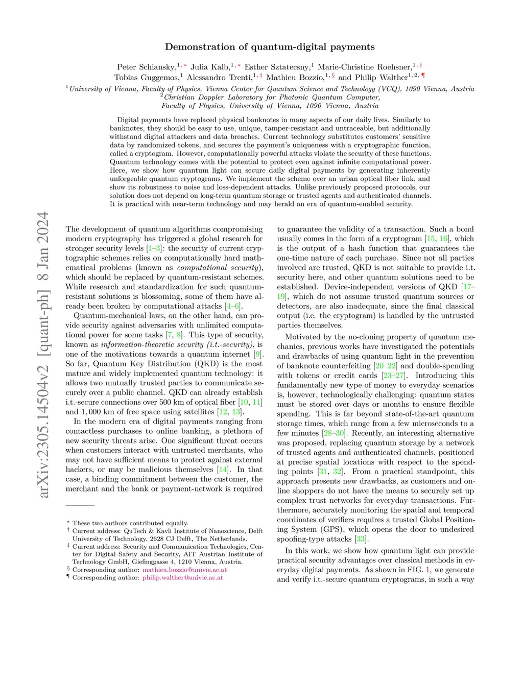 Digital payments have replaced physical banknotes in many aspects of our daily lives. Similarly to banknotes, they should be easy to use, unique, tamper-resistant and untraceable, but additionally withstand digital attackers and data breaches. Current technology substitutes customers' sensitive data by randomized tokens, and secures the payment's uniqueness with a cryptographic function, called a cryptogram. However, computationally powerful attacks violate the security of these functions. Quantum technology comes with the potential to protect even against infinite computational power. Here, we show how quantum light can secure daily digital payments by generating inherently unforgeable quantum cryptograms. We implement the scheme over an urban optical fiber link, and show its robustness to noise and loss-dependent attacks. Unlike previously proposed protocols, our solution does not depend on long-term quantum storage or trusted agents and authenticated channels. It is practical with near-term technology and may herald an era of quantum-enabled security.