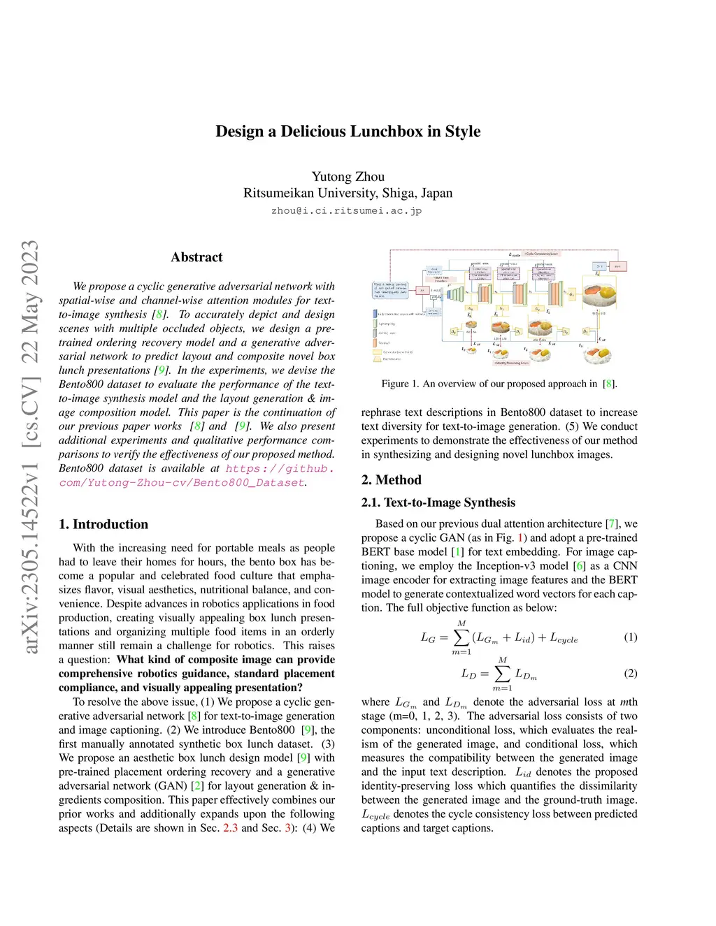We propose a cyclic generative adversarial network with spatial-wise and channel-wise attention modules for text-to-image synthesis. To accurately depict and design scenes with multiple occluded objects, we design a pre-trained ordering recovery model and a generative adversarial network to predict layout and composite novel box lunch presentations. In the experiments, we devise the Bento800 dataset to evaluate the performance of the text-to-image synthesis model and the layout generation & image composition model. This paper is the continuation of our previous paper works. We also present additional experiments and qualitative performance comparisons to verify the effectiveness of our proposed method. Bento800 dataset is available at https://github.com/Yutong-Zhou-cv/Bento800_Dataset