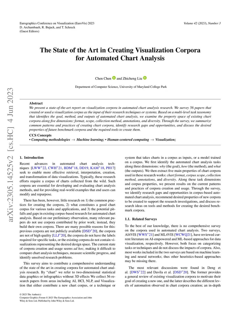 We present a state-of-the-art report on visualization corpora in automated chart analysis research. We survey 56 papers that created or used a visualization corpus as the input of their research techniques or systems. Based on a multi-level task taxonomy that identifies the goal, method, and outputs of automated chart analysis, we examine the property space of existing chart corpora along five dimensions: format, scope, collection method, annotations, and diversity. Through the survey, we summarize common patterns and practices of creating chart corpora, identify research gaps and opportunities, and discuss the desired properties of future benchmark corpora and the required tools to create them.