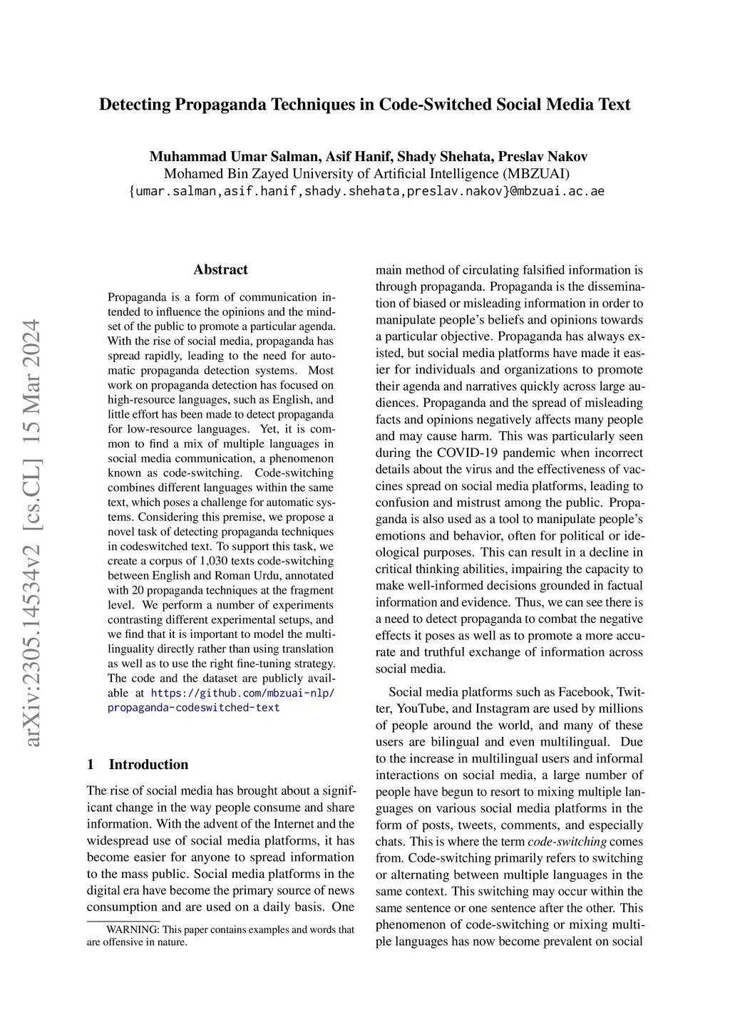 Detecting Propaganda Techniques in Code-Switched Social Media Text