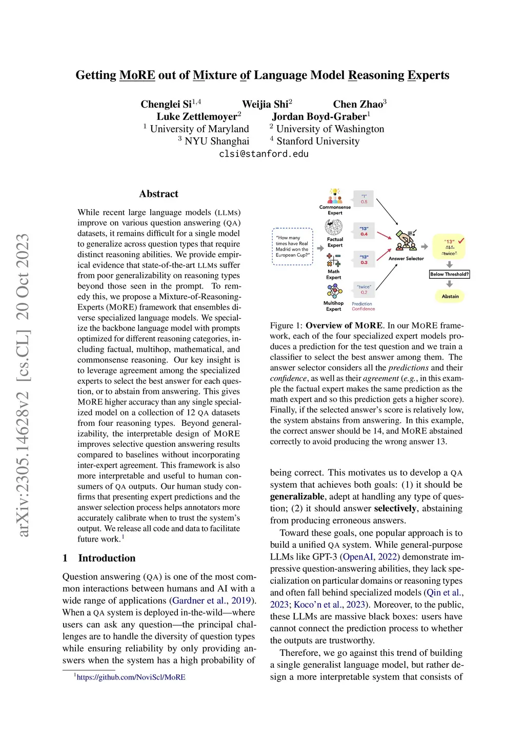 One of the ultimate quests of question answering (QA) is to deploy a system that can answer any type of question from the users, and refrain from answering when it does not know the answer. While recent advancements in scaling large language models (LLMs) brought significant improvements on various QA datasets, it remains difficult for a single model to generalize across question types that require distinct reasoning abilities. In this paper, we first provide empirical evidence that state-of-the-art LLMs such as Codex suffer from poor generalizability on question types beyond those seen in the prompt. To address this, we propose a Mixture-of-Prompt-Experts (MOPE) system that ensembles multiple specialized LLMs. We first implement each specialized model based on the same backbone model (Codex) but with prompts optimized for different reasoning categories including factual, multihop, mathematical, and commonsense reasoning. By strategically selecting the best specialized model for each given question, our MOPE system significantly outperforms any single specialized model on a collection of 12 QA datasets from four reasoning types. Moreover, the attribution and agreement among specialized expert models offer greater interpretability, allowing for better selective question answering. Our human study further confirms that presenting the expert predictions and answer selection process helps annotators more accurately decide when to trust the system's output. We release all code and data to facilitate future work.