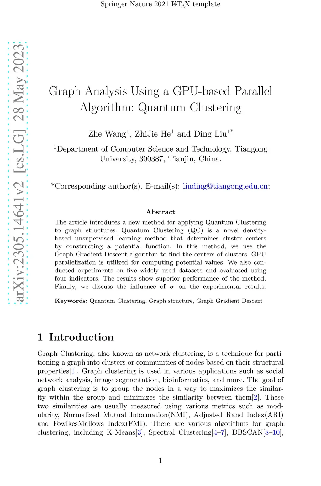 The article introduces a new method for applying Quantum Clustering to graph structures. Quantum Clustering (QC) is a novel density-based unsupervised learning method that determines cluster centers by constructing a potential function. In this method, we use the Graph Gradient Descent algorithm to find the centers of clusters. GPU parallelization is utilized for computing potential values. We also conducted experiments on five widely used datasets and evaluated using four indicators. The results show superior performance of the method. Finally, we discuss the influence of on the experimental results.