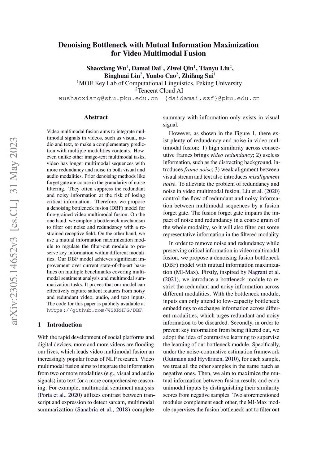 Denoising Bottleneck with Mutual Information Maximization for Video Multimodal Fusion