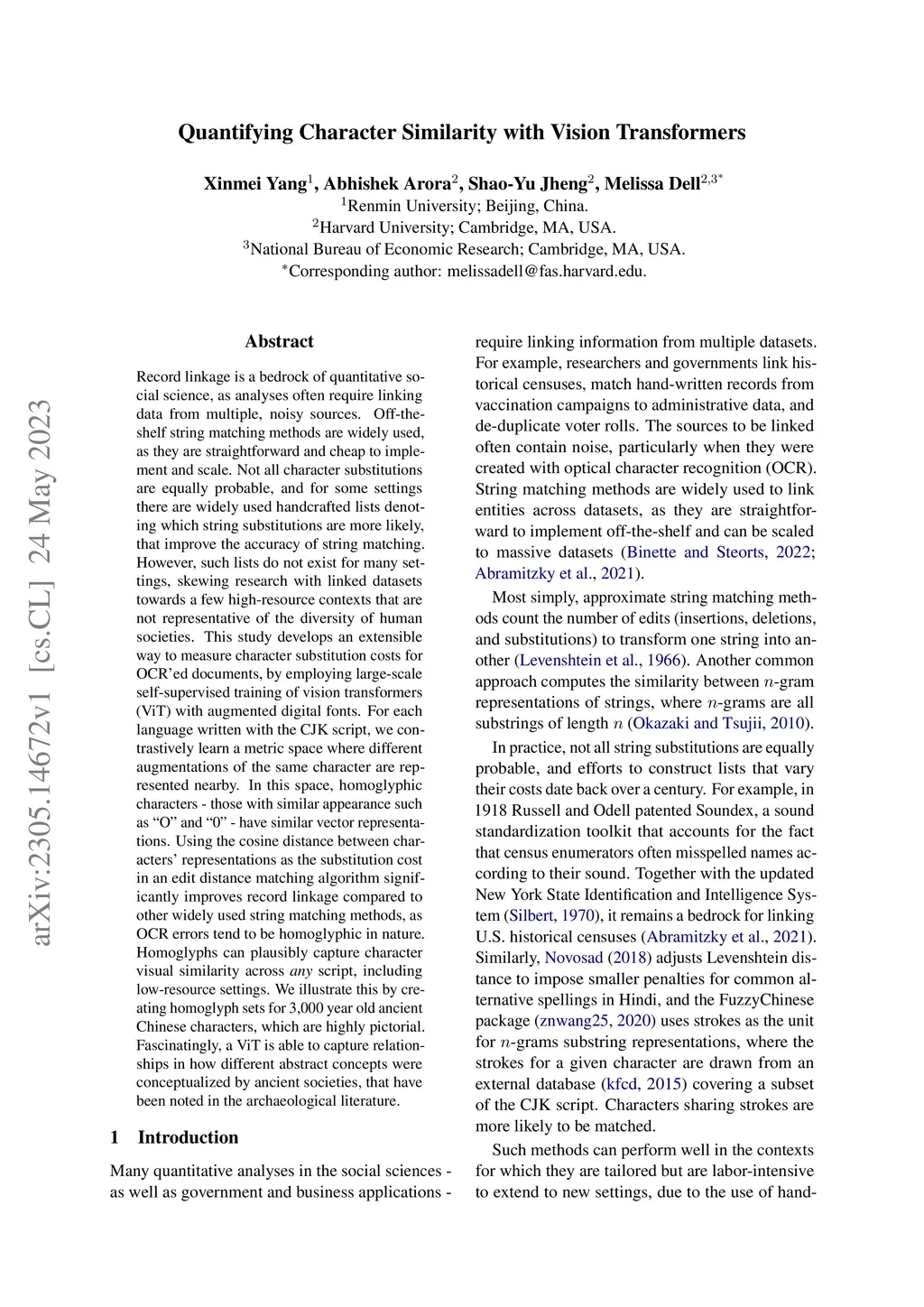 Record linkage is a bedrock of quantitative social science, as analyses often require linking data from multiple, noisy sources. Off-the-shelf string matching methods are widely used, as they are straightforward and cheap to implement and scale. Not all character substitutions are equally probable, and for some settings there are widely used handcrafted lists denoting which string substitutions are more likely, that improve the accuracy of string matching. However, such lists do not exist for many settings, skewing research with linked datasets towards a few high-resource contexts that are not representative of the diversity of human societies. This study develops an extensible way to measure character substitution costs for OCRéd documents, by employing large-scale self-supervised training of vision transformers (ViT) with augmented digital fonts. For each language written with the CJK script, we contrastively learn a metric space where different augmentations of the same character are represented nearby. In this space, homoglyphic characters - those with similar appearance such as ``O'' and ``0'' - have similar vector representations. Using the cosine distance between characters' representations as the substitution cost in an edit distance matching algorithm significantly improves record linkage compared to other widely used string matching methods, as OCR errors tend to be homoglyphic in nature. Homoglyphs can plausibly capture character visual similarity across any script, including low-resource settings. We illustrate this by creating homoglyph sets for 3,000 year old ancient Chinese characters, which are highly pictorial. Fascinatingly, a ViT is able to capture relationships in how different abstract concepts were conceptualized by ancient societies, that have been noted in the archaeological literature.