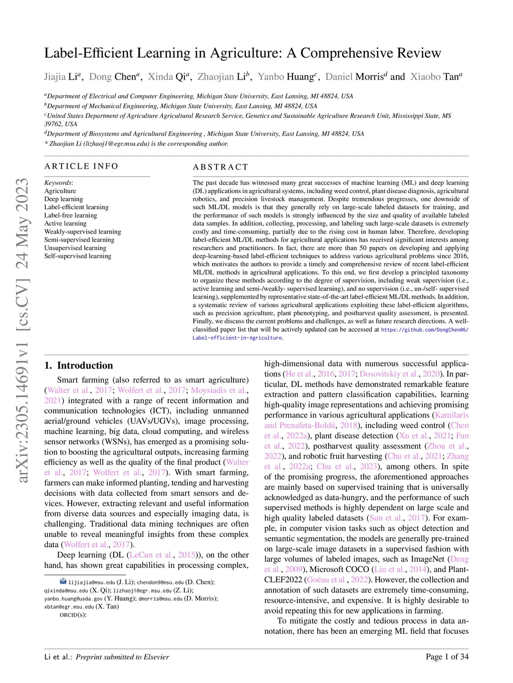 Label-Efficient Learning in Agriculture: A Comprehensive Review