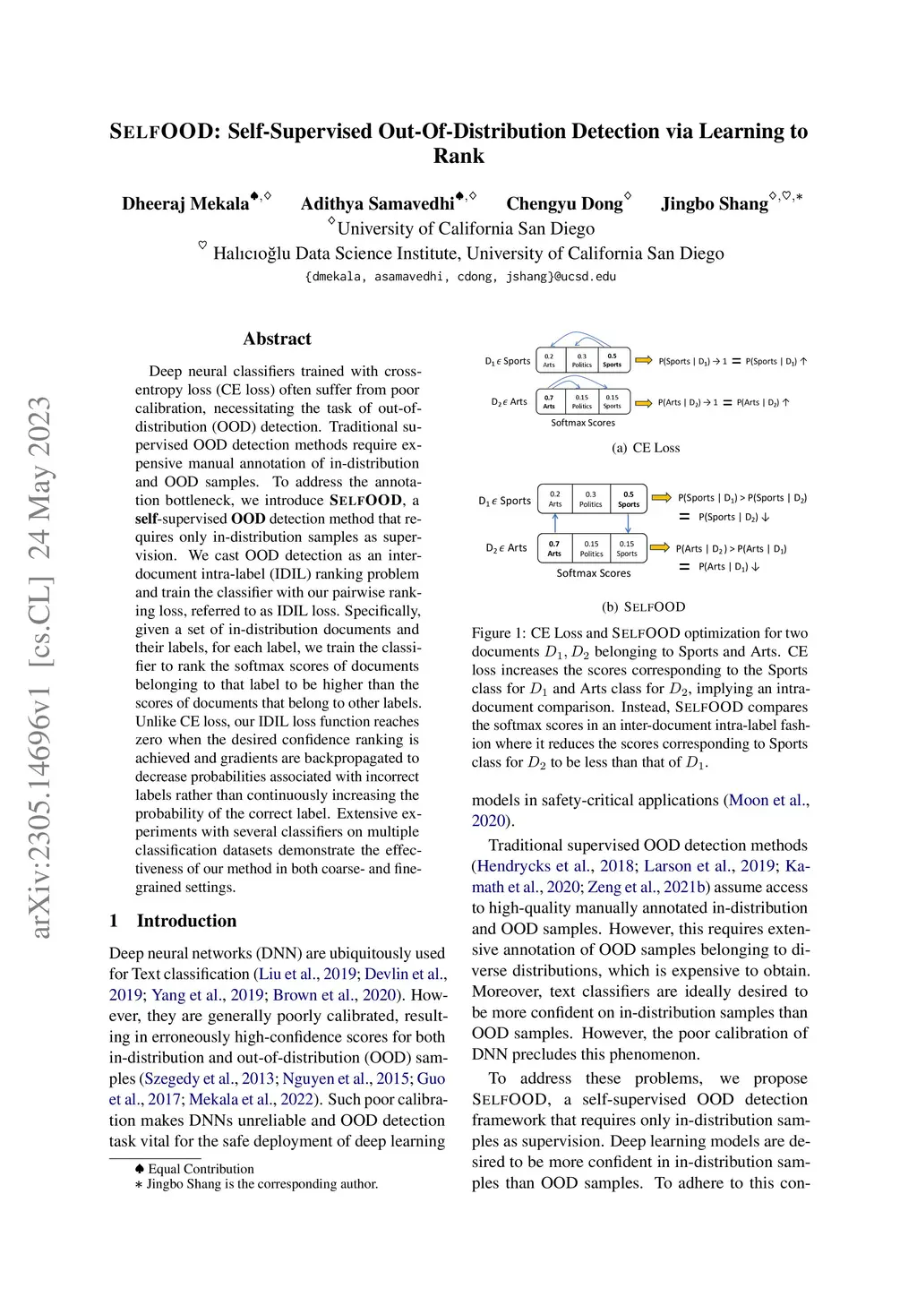 Deep neural classifiers trained with cross-entropy loss (CE loss) often suffer from poor calibration, necessitating the task of out-of-distribution (OOD) detection. Traditional supervised OOD detection methods require expensive manual annotation of in-distribution and OOD samples. To address the annotation bottleneck, we introduce SELFOOD, a self-supervised OOD detection method that requires only in-distribution samples as supervision. We cast OOD detection as an inter-document intra-label (IDIL) ranking problem and train the classifier with our pairwise ranking loss, referred to as IDIL loss. Specifically, given a set of in-distribution documents and their labels, for each label, we train the classifier to rank the softmax scores of documents belonging to that label to be higher than the scores of documents that belong to other labels. Unlike CE loss, our IDIL loss function reaches zero when the desired confidence ranking is achieved and gradients are backpropagated to decrease probabilities associated with incorrect labels rather than continuously increasing the probability of the correct label. Extensive experiments with several classifiers on multiple classification datasets demonstrate the effectiveness of our method in both coarse- and fine-grained settings.