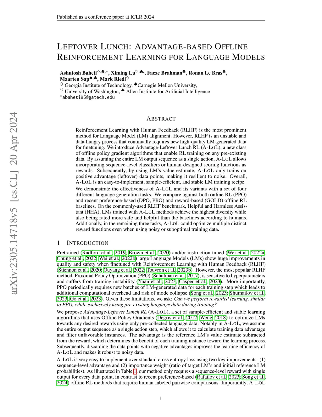 Reinforcement Learning with Human Feedback (RLHF) is the most prominent method for Language Model (LM) alignment. However, RLHF is an unstable and data-hungry process that continually requires new high-quality LM-generated data for finetuning. We introduce Advantage-Leftover Lunch RL (A-LoL), a new class of offline policy gradient algorithms that enable RL training on any pre-existing data. By assuming the entire LM output sequence as a single action, A-LoL allows incorporating sequence-level classifiers or human-designed scoring functions as rewards. Subsequently, by using LM's value estimate, A-LoL only trains on positive advantage (leftover) data points, making it resilient to noise. Overall, A-LoL is an easy-to-implement, sample-efficient, and stable LM training recipe. We demonstrate the effectiveness of A-LoL and its variants with a set of four different language generation tasks. We compare against both online RL (PPO) and recent preference-based (DPO, PRO) and reward-based (GOLD) offline RL baselines. On the commonly-used RLHF benchmark, Helpful and Harmless Assistant (HHA), LMs trained with A-LoL methods achieve the highest diversity while also being rated more safe and helpful than the baselines according to humans. Additionally, in the remaining three tasks, A-LoL could optimize multiple distinct reward functions even when using noisy or suboptimal training data. We also release our experimental code. https://github.com/abaheti95/LoL-RL