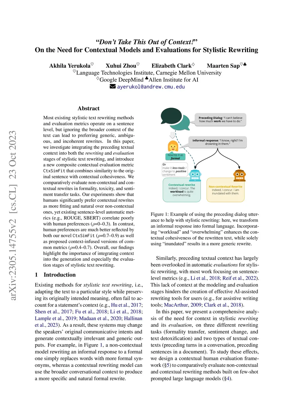 Most existing stylistic text rewriting methods and evaluation metrics operate on a sentence level, but ignoring the broader context of the text can lead to preferring generic, ambiguous, and incoherent rewrites. In this paper, we investigate integrating the preceding textual context into both the and stages of stylistic text rewriting, and introduce a new composite contextual evaluation metric that combines similarity to the original sentence with contextual cohesiveness. We comparatively evaluate non-contextual and contextual rewrites in formality, toxicity, and sentiment transfer tasks. Our experiments show that humans significantly prefer contextual rewrites as more fitting and natural over non-contextual ones, yet existing sentence-level automatic metrics (e.g., ROUGE, SBERT) correlate poorly with human preferences (=0--0.3). In contrast, human preferences are much better reflected by both our novel (=0.7--0.9) as well as proposed context-infused versions of common metrics (=0.4--0.7). Overall, our findings highlight the importance of integrating context into the generation and especially the evaluation stages of stylistic text rewriting.
