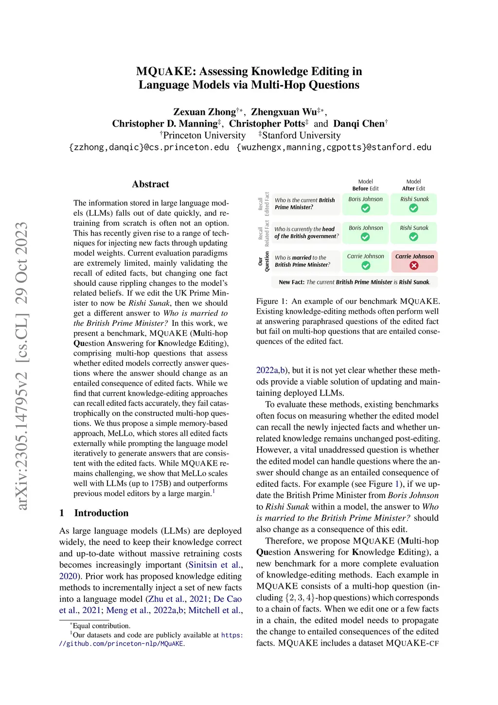 The information stored in large language models (LLMs) falls out of date quickly, and retraining from scratch is often not an option. This has recently given rise to a range of techniques for injecting new facts through updating model weights. Current evaluation paradigms are extremely limited, mainly validating the recall of edited facts, but changing one fact should cause rippling changes to the model's related beliefs. If we edit the UK Prime Minister to now be Rishi Sunak, then we should get a different answer to Who is married to the British Prime Minister? In this work, we present a benchmark, MQuAKE (Multi-hop Question Answering for Knowledge Editing), comprising multi-hop questions that assess whether edited models correctly answer questions where the answer should change as an entailed consequence of edited facts. While we find that current knowledge-editing approaches can recall edited facts accurately, they fail catastrophically on the constructed multi-hop questions. We thus propose a simple memory-based approach, MeLLo, which stores all edited facts externally while prompting the language model iteratively to generate answers that are consistent with the edited facts. While MQuAKE remains challenging, we show that MeLLo scales well with LLMs (up to 175B) and outperforms previous model editors by a large margin.