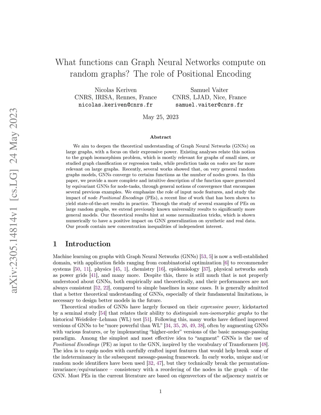 We aim to deepen the theoretical understanding of Graph Neural Networks (GNNs) on large graphs, with a focus on their expressive power. Existing analyses relate this notion to the graph isomorphism problem, which is mostly relevant for graphs of small sizes, or studied graph classification or regression tasks, while prediction tasks on nodes are far more relevant on large graphs. Recently, several works showed that, on very general random graphs models, GNNs converge to certains functions as the number of nodes grows. In this paper, we provide a more complete and intuitive description of the function space generated by equivariant GNNs for node-tasks, through general notions of convergence that encompass several previous examples. We emphasize the role of input node features, and study the impact of node Positional Encodings (PEs), a recent line of work that has been shown to yield state-of-the-art results in practice. Through the study of several examples of PEs on large random graphs, we extend previously known universality results to significantly more general models. Our theoretical results hint at some normalization tricks, which is shown numerically to have a positive impact on GNN generalization on synthetic and real data. Our proofs contain new concentration inequalities of independent interest.
