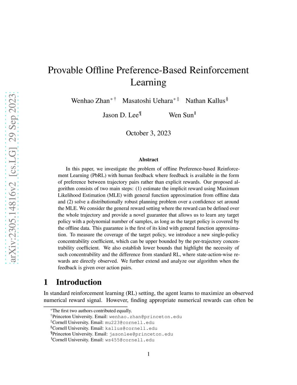 In this paper, we investigate the problem of offline Preference-based Reinforcement Learning (PbRL) with human feedback where feedback is available in the form of preference between trajectory pairs rather than explicit rewards. Our proposed algorithm consists of two main steps: (1) estimate the implicit reward using Maximum Likelihood Estimation (MLE) with general function approximation from offline data and (2) solve a distributionally robust planning problem over a confidence set around the MLE. We consider the general reward setting where the reward can be defined over the whole trajectory and provide a novel guarantee that allows us to learn any target policy with a polynomial number of samples, as long as the target policy is covered by the offline data. This guarantee is the first of its kind with general function approximation. To measure the coverage of the target policy, we introduce a new single-policy concentrability coefficient, which can be upper bounded by the per-trajectory concentrability coefficient. We also establish lower bounds that highlight the necessity of such concentrability and the difference from standard RL, where state-action-wise rewards are directly observed. We further extend and analyze our algorithm when the feedback is given over action pairs.