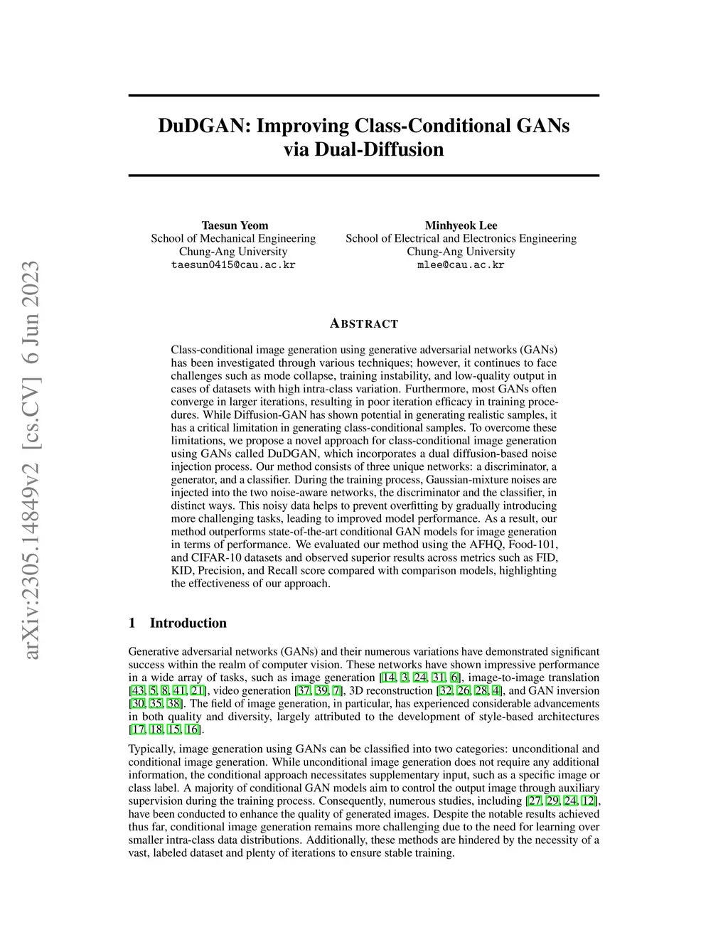 DuDGAN: Improving Class-Conditional GANs via Dual-Diffusion