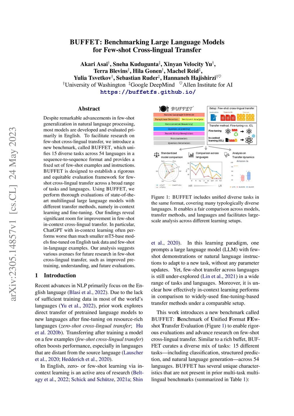 Despite remarkable advancements in few-shot generalization in natural language processing, most models are developed and evaluated primarily in English. To facilitate research on few-shot cross-lingual transfer, we introduce a new benchmark, called BUFFET, which unifies 15 diverse tasks across 54 languages in a sequence-to-sequence format and provides a fixed set of few-shot examples and instructions. BUFFET is designed to establish a rigorous and equitable evaluation framework for few-shot cross-lingual transfer across a broad range of tasks and languages. Using BUFFET, we perform thorough evaluations of state-of-the-art multilingual large language models with different transfer methods, namely in-context learning and fine-tuning. Our findings reveal significant room for improvement in few-shot in-context cross-lingual transfer. In particular, ChatGPT with in-context learning often performs worse than much smaller mT5-base models fine-tuned on English task data and few-shot in-language examples. Our analysis suggests various avenues for future research in few-shot cross-lingual transfer, such as improved pretraining, understanding, and future evaluations.
