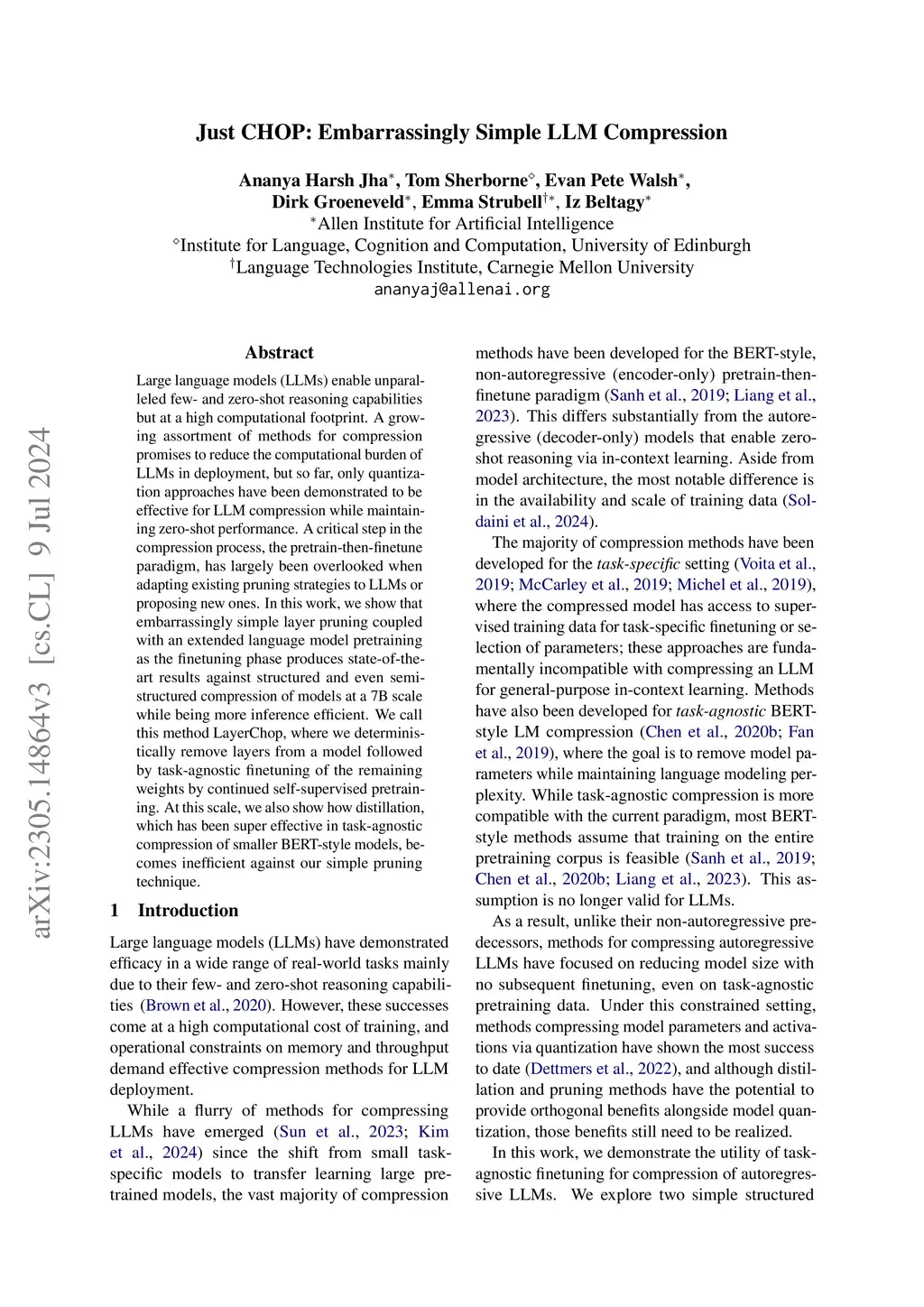Large language models (LLMs) enable unparalleled few- and zero-shot reasoning capabilities but at a high computational footprint. A growing assortment of methods for compression promises to reduce the computational burden of LLMs in deployment, but so far, only quantization approaches have been demonstrated to be effective for LLM compression while maintaining zero-shot performance. A critical step in the compression process, the pretrain-then-finetune paradigm, has largely been overlooked when adapting existing pruning strategies to LLMs or proposing new ones. In this work, we show that embarrassingly simple layer pruning coupled with an extended language model pretraining as the finetuning phase produces state-of-the-art results against structured and even semi-structured compression of models at a 7B scale while being more inference efficient. We call this method LayerChop, where we deterministically remove layers from a model followed by task-agnostic finetuning of the remaining weights by continued self-supervised pretraining. At this scale, we also show how distillation, which has been super effective in task-agnostic compression of smaller BERT-style models, becomes inefficient against our simple pruning technique.