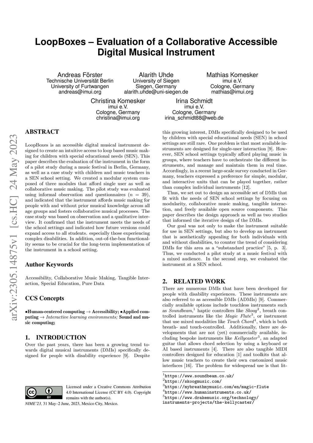 LoopBoxes is an accessible digital musical instrument designed to create an intuitive access to loop based music making for children with special educational needs (SEN). This paper describes the evaluation of the instrument in the form of a pilot study during a music festival in Berlin, Germany, as well as a case study with children and music teachers in a SEN school setting. We created a modular system composed of three modules that afford single user as well as collaborative music making. The pilot study was evaluated using informal observation and questionnaires (n = 39), and indicated that the instrument affords music making for people with and without prior musical knowledge across all age groups and fosters collaborative musical processes. The case study was based on observation and a qualitative interview. It confirmed that the instrument meets the needs of the school settings and indicated how future versions could expand access to all students, especially those experiencing complex disabilities. In addition, out-of-the-box functionality seems to be crucial for the long-term implementation of the instrument in a school setting.