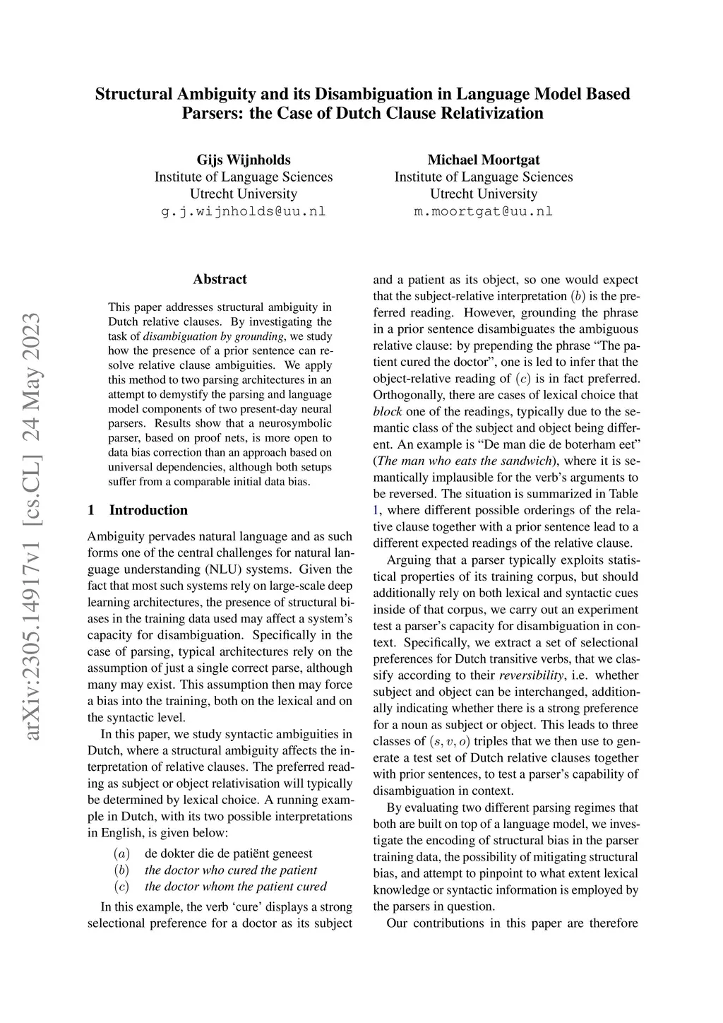 This paper addresses structural ambiguity in Dutch relative clauses. By investigating the task of disambiguation by grounding, we study how the presence of a prior sentence can resolve relative clause ambiguities. We apply this method to two parsing architectures in an attempt to demystify the parsing and language model components of two present-day neural parsers. Results show that a neurosymbolic parser, based on proof nets, is more open to data bias correction than an approach based on universal dependencies, although both setups suffer from a comparable initial data bias.