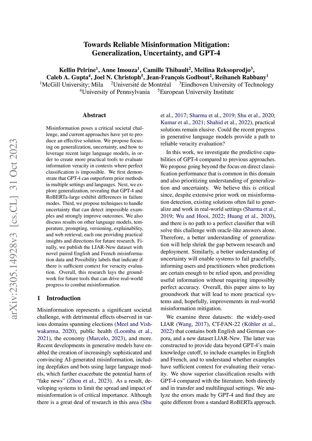 Misinformation poses a critical societal challenge, and current approaches have yet to produce an effective solution. We propose focusing on generalization, uncertainty, and how to leverage recent large language models, in order to create more practical tools to evaluate information veracity in contexts where perfect classification is impossible. We first demonstrate that GPT-4 can outperform prior methods in multiple settings and languages. Next, we explore generalization, revealing that GPT-4 and RoBERTa-large exhibit differences in failure modes. Third, we propose techniques to handle uncertainty that can detect impossible examples and strongly improve outcomes. We also discuss results on other language models, temperature, prompting, versioning, explainability, and web retrieval, each one providing practical insights and directions for future research. Finally, we publish the LIAR-New dataset with novel paired English and French misinformation data and Possibility labels that indicate if there is sufficient context for veracity evaluation. Overall, this research lays the groundwork for future tools that can drive real-world progress to combat misinformation.