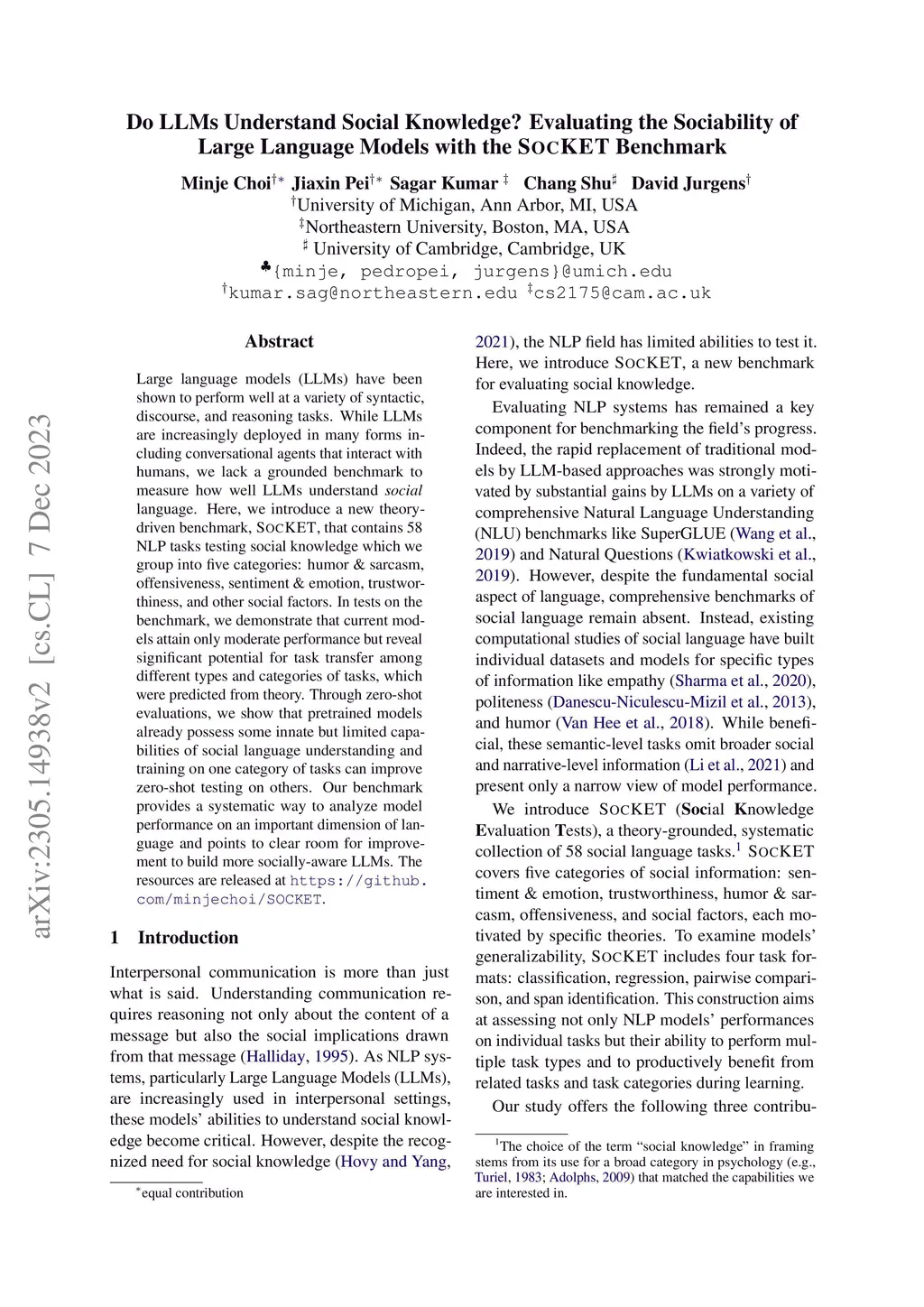 Large language models (LLMs) have been shown to perform well at a variety of syntactic, discourse, and reasoning tasks. While LLMs are increasingly deployed in many forms including conversational agents that interact with humans, we lack a grounded benchmark to measure how well LLMs understand \textit{social} language. Here, we introduce a new theory-driven benchmark, SocKET, that contains 58 NLP tasks testing social knowledge which we group into five categories: humor & sarcasm, offensiveness, sentiment & emotion, and trustworthiness. In tests on the benchmark, we demonstrate that current models attain only moderate performance but reveal significant potential for task transfer among different types and categories of tasks, which were predicted from theory. Through zero-shot evaluations, we show that pretrained models already possess some innate but limited capabilities of social language understanding and training on one category of tasks can improve zero-shot testing on others. Our benchmark provides a systematic way to analyze model performance on an important dimension of language and points to clear room for improvement to build more socially-aware LLMs. The associated resources are released at https://github.com/minjechoi/SOCKET.
