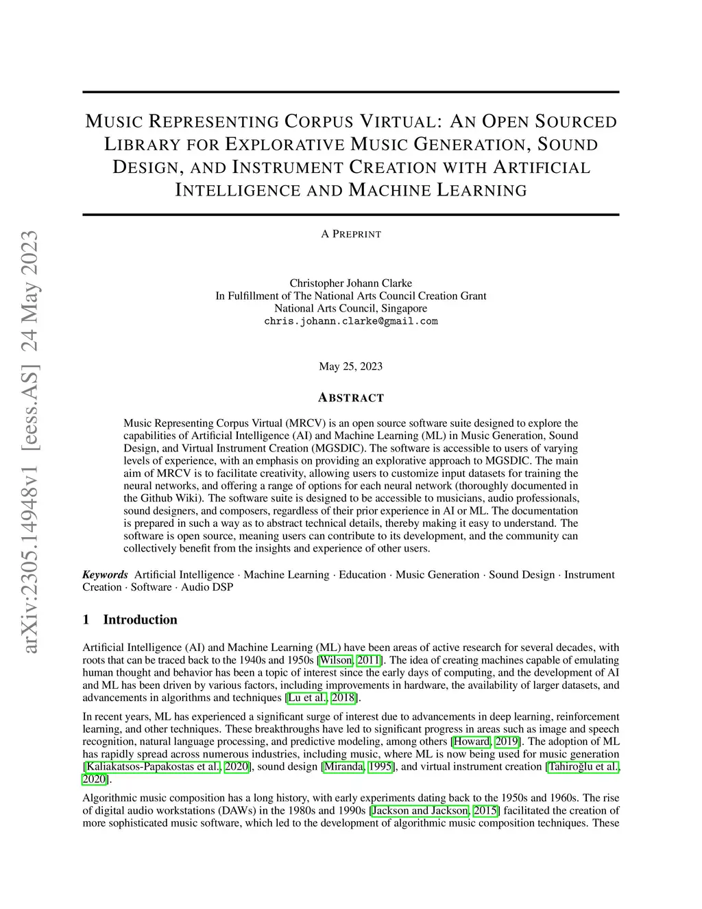Music Representing Corpus Virtual (MRCV) is an open source software suite designed to explore the capabilities of Artificial Intelligence (AI) and Machine Learning (ML) in Music Generation, Sound Design, and Virtual Instrument Creation (MGSDIC). The software is accessible to users of varying levels of experience, with an emphasis on providing an explorative approach to MGSDIC. The main aim of MRCV is to facilitate creativity, allowing users to customize input datasets for training the neural networks, and offering a range of options for each neural network (thoroughly documented in the Github Wiki). The software suite is designed to be accessible to musicians, audio professionals, sound designers, and composers, regardless of their prior experience in AI or ML. The documentation is prepared in such a way as to abstract technical details, thereby making it easy to understand. The software is open source, meaning users can contribute to its development, and the community can collectively benefit from the insights and experience of other users.