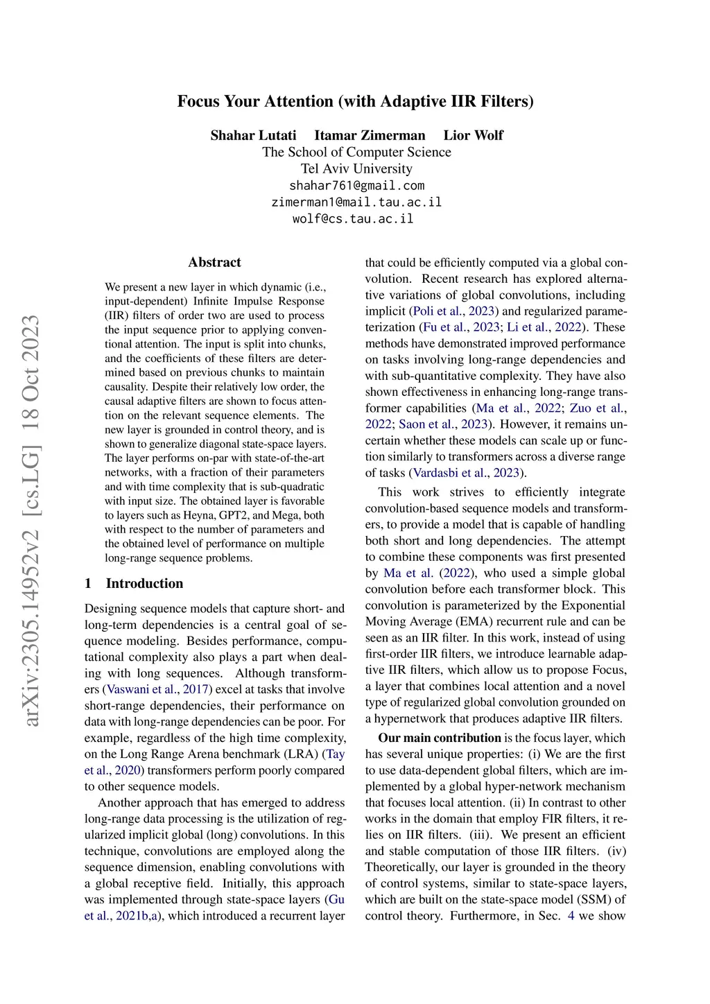 We present a new layer in which dynamic (i.e.,input-dependent) Infinite Impulse Response (IIR) filters of order two are used to process the input sequence prior to applying conventional attention. The input is split into chunks, and the coefficients of these filters are determined based on previous chunks to maintain causality. Despite their relatively low order, the causal adaptive filters are shown to focus attention on the relevant sequence elements. The new layer is grounded in control theory, and is shown to generalize diagonal state-space layers. The layer performs on-par with state-of-the-art networks, with a fraction of their parameters and with time complexity that is sub-quadratic with input size. The obtained layer is favorable to layers such as Heyna, GPT2, and Mega, both with respect to the number of parameters and the obtained level of performance on multiple long-range sequence problems.