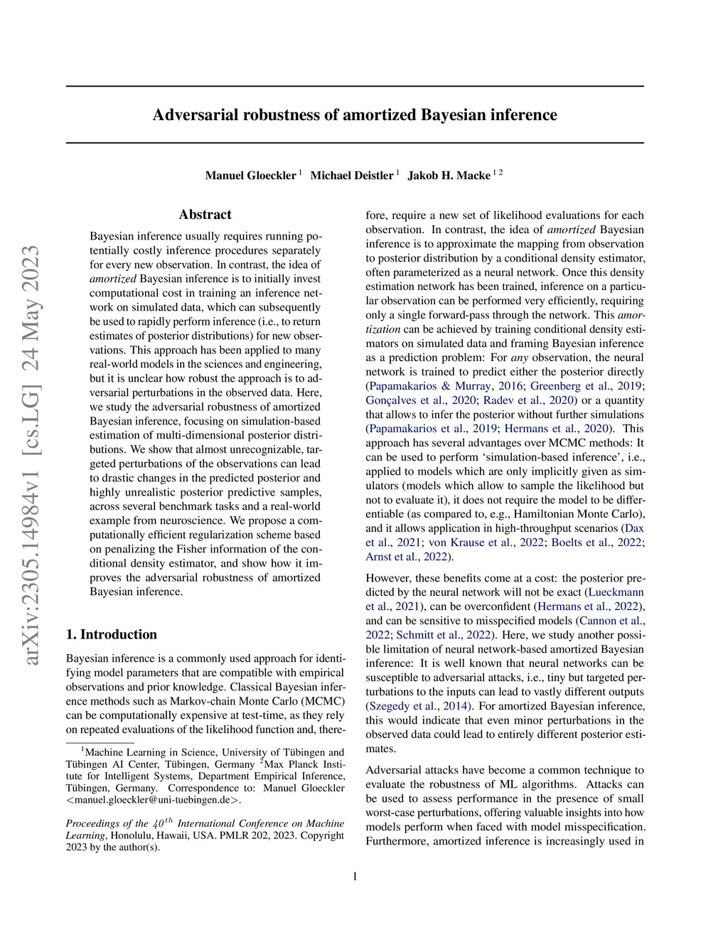 Bayesian inference usually requires running potentially costly inference procedures separately for every new observation. In contrast, the idea of amortized Bayesian inference is to initially invest computational cost in training an inference network on simulated data, which can subsequently be used to rapidly perform inference (i.e., to return estimates of posterior distributions) for new observations. This approach has been applied to many real-world models in the sciences and engineering, but it is unclear how robust the approach is to adversarial perturbations in the observed data. Here, we study the adversarial robustness of amortized Bayesian inference, focusing on simulation-based estimation of multi-dimensional posterior distributions. We show that almost unrecognizable, targeted perturbations of the observations can lead to drastic changes in the predicted posterior and highly unrealistic posterior predictive samples, across several benchmark tasks and a real-world example from neuroscience. We propose a computationally efficient regularization scheme based on penalizing the Fisher information of the conditional density estimator, and show how it improves the adversarial robustness of amortized Bayesian inference.