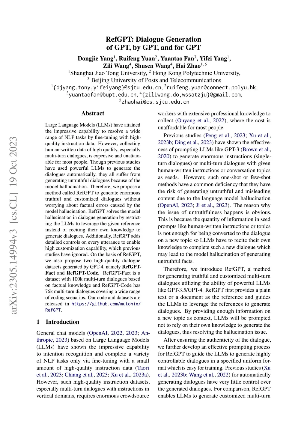 Large Language Models (LLMs) have attained the impressive capability to resolve a wide range of NLP tasks by fine-tuning high-quality instruction data. However, collecting human-written data of high quality, especially multi-turn dialogues, is expensive and unattainable for most people. Though previous studies have used powerful LLMs to generate the dialogues automatically, they all suffer from generating untruthful dialogues because of the model hallucination. Therefore, we propose a method called RefGPT to generate enormous truthful and customized dialogues without worrying about factual errors caused by the model hallucination. RefGPT solves the model hallucination in dialogue generation by restricting the LLMs to leverage the given reference instead of reciting their own knowledge to generate dialogues. Additionally, RefGPT adds detailed controls on every utterance to enable high customization capability, which previous studies have ignored. On the basis of RefGPT, we also propose two high-quality dialogue datasets generated by GPT-4, namely RefGPT-Fact and RefGPT-Code. RefGPT-Fact is a dataset with 100k multi-turn dialogues based on factual knowledge and RefGPT-Code has 76k multi-turn dialogues covering a wide range of coding scenarios. Our code and datasets are released in https://github.com/mutonix/RefGPT.