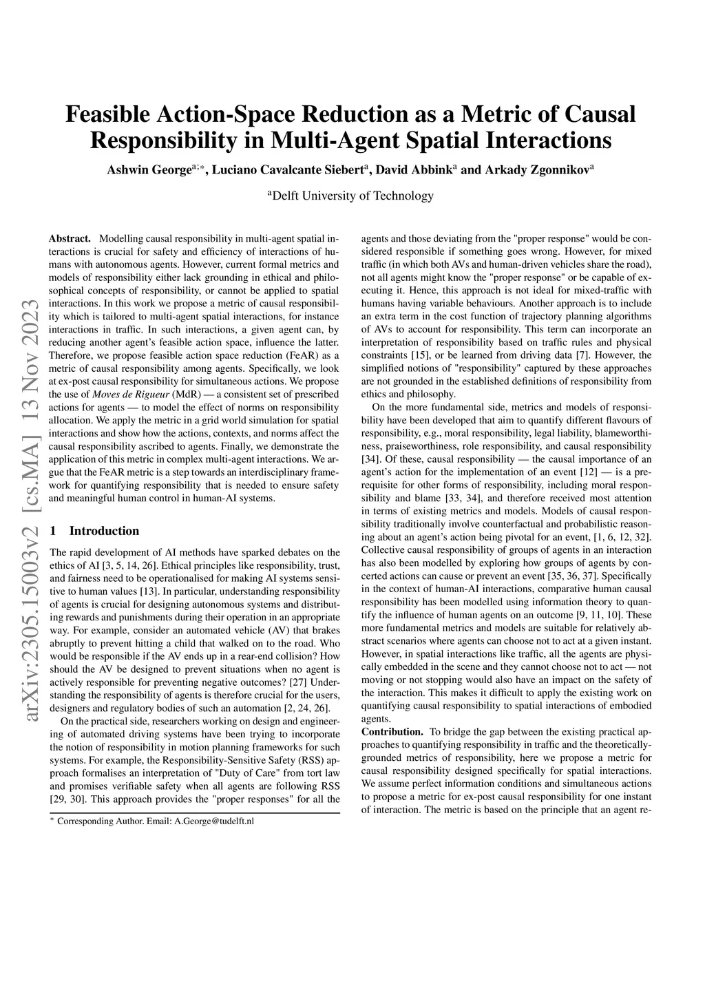 Modelling causal responsibility in multi-agent spatial interactions is crucial for safety and efficiency of interactions of humans with autonomous agents. However, current formal metrics and models of responsibility either lack grounding in ethical and philosophical concepts of responsibility, or cannot be applied to spatial interactions. In this work we propose a metric of causal responsibility which is tailored to multi-agent spatial interactions, for instance interactions in traffic. In such interactions, a given agent can, by reducing another agent's feasible action space, influence the latter. Therefore, we propose feasible action space reduction (FeAR) as a metric of causal responsibility among agents. Specifically, we look at ex-post causal responsibility for simultaneous actions. We propose the use of Moves de Rigueur (MdR) - a consistent set of prescribed actions for agents - to model the effect of norms on responsibility allocation. We apply the metric in a grid world simulation for spatial interactions and show how the actions, contexts, and norms affect the causal responsibility ascribed to agents. Finally, we demonstrate the application of this metric in complex multi-agent interactions. We argue that the FeAR metric is a step towards an interdisciplinary framework for quantifying responsibility that is needed to ensure safety and meaningful human control in human-AI systems.