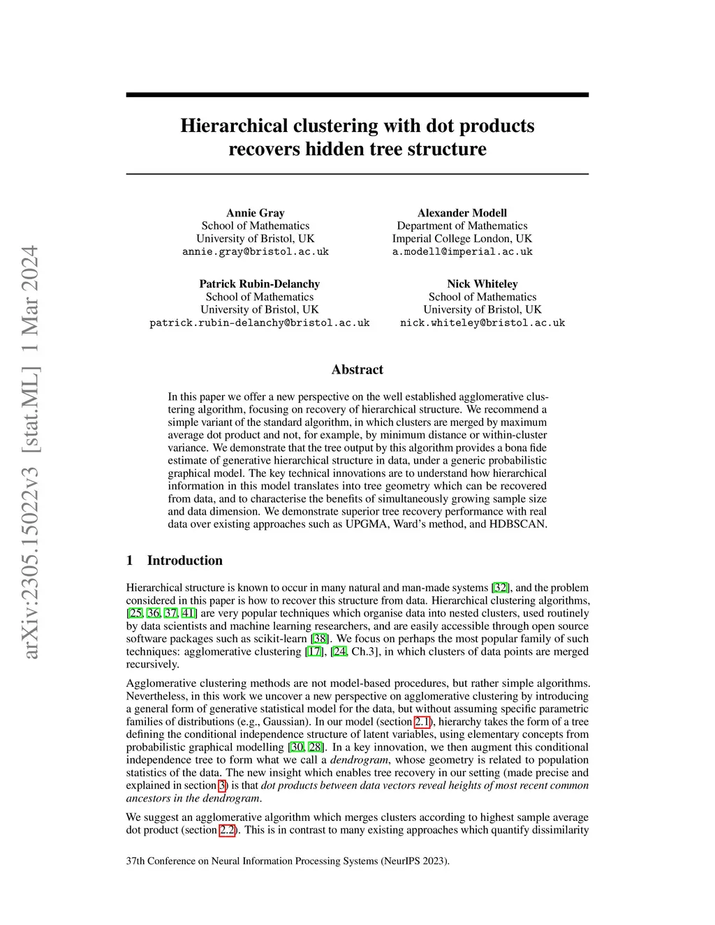 In this paper we offer a new perspective on the well established agglomerative clustering algorithm, focusing on recovery of hierarchical structure. We recommend a simple variant of the standard algorithm, in which clusters are merged by maximum average dot product and not, for example, by minimum distance or within-cluster variance. We demonstrate that the tree output by this algorithm provides a bona fide estimate of generative hierarchical structure in data, under a generic probabilistic graphical model. The key technical innovations are to understand how hierarchical information in this model translates into tree geometry which can be recovered from data, and to characterise the benefits of simultaneously growing sample size and data dimension. We demonstrate superior tree recovery performance with real data over existing approaches such as UPGMA, Ward's method, and HDBSCAN.