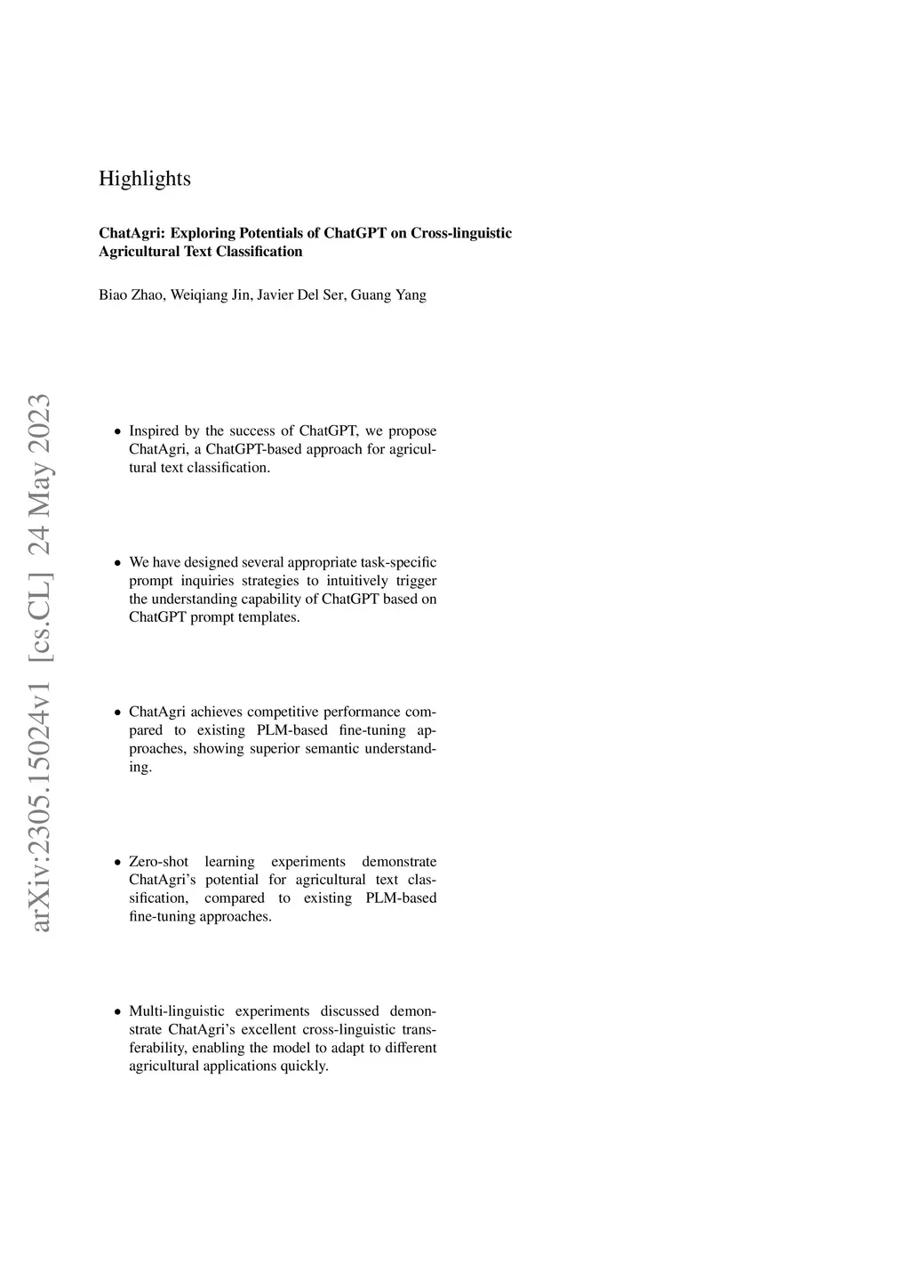 In the era of sustainable smart agriculture, a massive amount of agricultural news text is being posted on the Internet, in which massive agricultural knowledge has been accumulated. In this context, it is urgent to explore effective text classification techniques for users to access the required agricultural knowledge with high efficiency. Mainstream deep learning approaches employing fine-tuning strategies on pre-trained language models (PLMs), have demonstrated remarkable performance gains over the past few years. Nonetheless, these methods still face many drawbacks that are complex to solve, including: 1. Limited agricultural training data due to the expensive-cost and labour-intensive annotation; 2. Poor domain transferability, especially of cross-linguistic ability; 3. Complex and expensive large models deployment.Inspired by the extraordinary success brought by the recent ChatGPT (e.g. GPT-3.5, GPT-4), in this work, we systematically investigate and explore the capability and utilization of ChatGPT applying to the agricultural informatization field. ....(shown in article).... Code has been released on Github https://github.com/albert-jin/agricultural_textual_classification_ChatGPT.