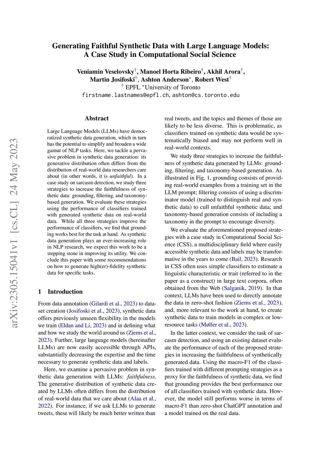 Large Language Models (LLMs) have democratized synthetic data generation, which in turn has the potential to simplify and broaden a wide gamut of NLP tasks. Here, we tackle a pervasive problem in synthetic data generation: its generative distribution often differs from the distribution of real-world data researchers care about (in other words, it is unfaithful). In a case study on sarcasm detection, we study three strategies to increase the faithfulness of synthetic data: grounding, filtering, and taxonomy-based generation. We evaluate these strategies using the performance of classifiers trained with generated synthetic data on real-world data. While all three strategies improve the performance of classifiers, we find that grounding works best for the task at hand. As synthetic data generation plays an ever-increasing role in NLP research, we expect this work to be a stepping stone in improving its utility. We conclude this paper with some recommendations on how to generate high(er)-fidelity synthetic data for specific tasks.