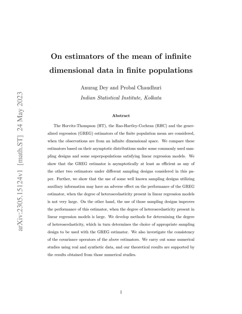 The Horvitz-Thompson (HT), the Rao-Hartley-Cochran (RHC) and the generalized regression (GREG) estimators of the finite population mean are considered, when the observations are from an infinite dimensional space. We compare these estimators based on their asymptotic distributions under some commonly used sampling designs and some superpopulations satisfying linear regression models. We show that the GREG estimator is asymptotically at least as efficient as any of the other two estimators under different sampling designs considered in this paper. Further, we show that the use of some well known sampling designs utilizing auxiliary information may have an adverse effect on the performance of the GREG estimator, when the degree of heteroscedasticity present in linear regression models is not very large. On the other hand, the use of those sampling designs improves the performance of this estimator, when the degree of heteroscedasticity present in linear regression models is large. We develop methods for determining the degree of heteroscedasticity, which in turn determines the choice of appropriate sampling design to be used with the GREG estimator. We also investigate the consistency of the covariance operators of the above estimators. We carry out some numerical studies using real and synthetic data, and our theoretical results are supported by the results obtained from those numerical studies.