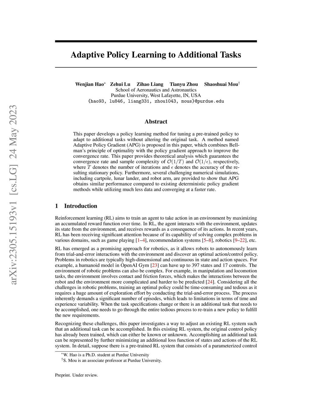 This paper develops a policy learning method for tuning a pre-trained policy to adapt to additional tasks without altering the original task. A method named Adaptive Policy Gradient (APG) is proposed in this paper, which combines Bellman's principle of optimality with the policy gradient approach to improve the convergence rate. This paper provides theoretical analysis which guarantees the convergence rate and sample complexity of and , respectively, where denotes the number of iterations and denotes the accuracy of the resulting stationary policy. Furthermore, several challenging numerical simulations, including cartpole, lunar lander, and robot arm, are provided to show that APG obtains similar performance compared to existing deterministic policy gradient methods while utilizing much less data and converging at a faster rate.