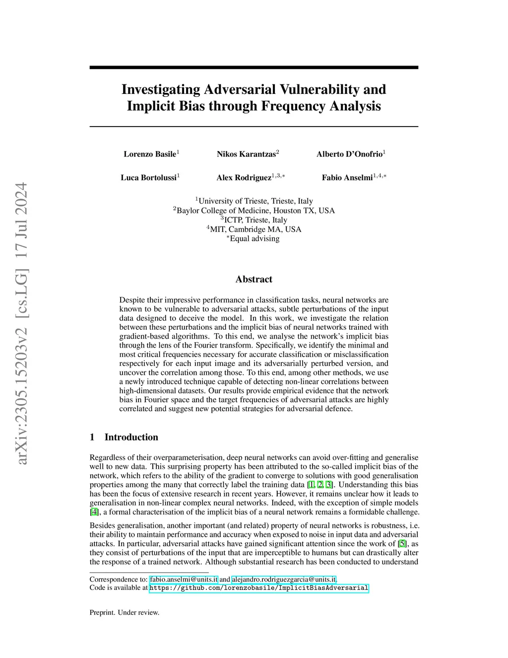 Despite their impressive performance in classification tasks, neural networks are known to be vulnerable to adversarial attacks, subtle perturbations of the input data designed to deceive the model. In this work, we investigate the correlation between these perturbations and the implicit bias of neural networks trained with gradient-based algorithms. To this end, we analyse a representation of the network's implicit bias through the lens of the Fourier transform. Specifically, we identify unique fingerprints of implicit bias and adversarial attacks by calculating the minimal, essential frequencies needed for accurate classification of each image, as well as the frequencies that drive misclassification in its adversarially perturbed counterpart. This approach enables us to uncover and analyse the correlation between these essential frequencies, providing a precise map of how the network's biases align or contrast with the frequency components exploited by adversarial attacks. To this end, among other methods, we use a newly introduced technique capable of detecting nonlinear correlations between high-dimensional datasets. Our results provide empirical evidence that the network bias in Fourier space and the target frequencies of adversarial attacks are highly correlated and suggest new potential strategies for adversarial defence.