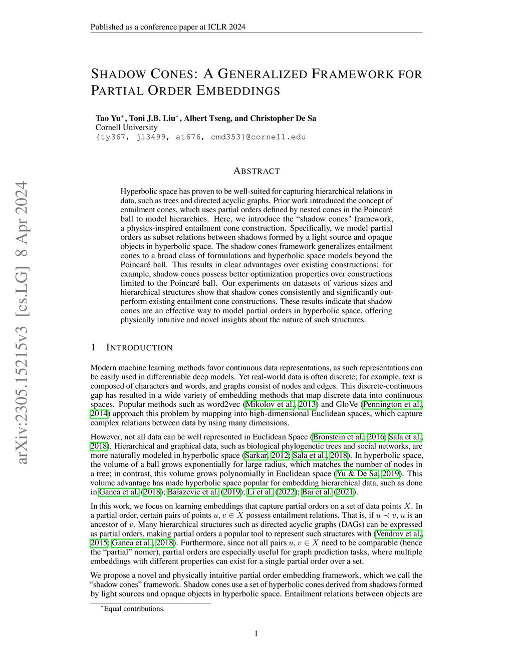 Hyperbolic space has proven to be well-suited for capturing hierarchical relations in data, such as trees and directed acyclic graphs. Prior work introduced the concept of entailment cones, which uses partial orders defined by nested cones in the Poincar\'e ball to model hierarchies. Here, we introduce the ``shadow cones" framework, a physics-inspired entailment cone construction. Specifically, we model partial orders as subset relations between shadows formed by a light source and opaque objects in hyperbolic space. The shadow cones framework generalizes entailment cones to a broad class of formulations and hyperbolic space models beyond the Poincar\'e ball. This results in clear advantages over existing constructions: for example, shadow cones possess better optimization properties over constructions limited to the Poincar\'e ball. Our experiments on datasets of various sizes and hierarchical structures show that shadow cones consistently and significantly outperform existing entailment cone constructions. These results indicate that shadow cones are an effective way to model partial orders in hyperbolic space, offering physically intuitive and novel insights about the nature of such structures.