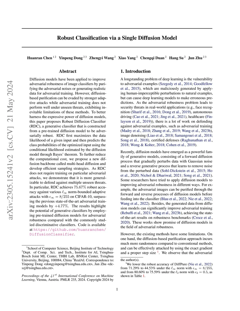 Diffusion models have been applied to improve adversarial robustness of image classifiers by purifying the adversarial noises or generating realistic data for adversarial training. However, diffusion-based purification can be evaded by stronger adaptive attacks while adversarial training does not perform well under unseen threats, exhibiting inevitable limitations of these methods. To better harness the expressive power of diffusion models, this paper proposes Robust Diffusion Classifier (RDC), a generative classifier that is constructed from a pre-trained diffusion model to be adversarially robust. RDC first maximizes the data likelihood of a given input and then predicts the class probabilities of the optimized input using the conditional likelihood estimated by the diffusion model through Bayes' theorem. To further reduce the computational cost, we propose a new diffusion backbone called multi-head diffusion and develop efficient sampling strategies. As RDC does not require training on particular adversarial attacks, we demonstrate that it is more generalizable to defend against multiple unseen threats. In particular, RDC achieves robust accuracy against various norm-bounded adaptive attacks with on CIFAR-10, surpassing the previous state-of-the-art adversarial training models by . The results highlight the potential of generative classifiers by employing pre-trained diffusion models for adversarial robustness compared with the commonly studied discriminative classifiers. Code is available at \url{https://github.com/huanranchen/DiffusionClassifier}.