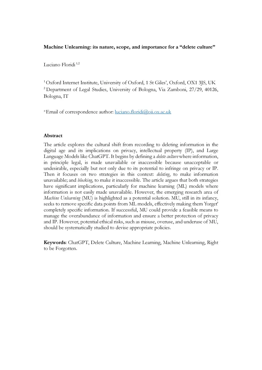 The article explores the cultural shift from recording to deleting information in the digital age and its implications on privacy, intellectual property (IP), and Large Language Models like ChatGPT. It begins by defining a delete culture where information, in principle legal, is made unavailable or inaccessible because unacceptable or undesirable, especially but not only due to its potential to infringe on privacy or IP. Then it focuses on two strategies in this context: deleting, to make information unavailable; and blocking, to make it inaccessible. The article argues that both strategies have significant implications, particularly for machine learning (ML) models where information is not easily made unavailable. However, the emerging research area of Machine Unlearning (MU) is highlighted as a potential solution. MU, still in its infancy, seeks to remove specific data points from ML models, effectively making them 'forget' completely specific information. If successful, MU could provide a feasible means to manage the overabundance of information and ensure a better protection of privacy and IP. However, potential ethical risks, such as misuse, overuse, and underuse of MU, should be systematically studied to devise appropriate policies.